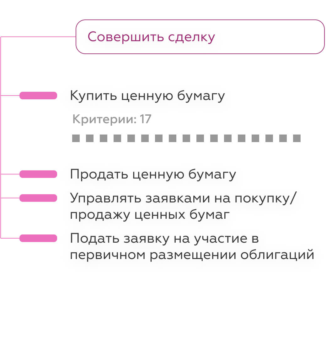 Например, в группу «Совершить сделку» входят 4 сценария, которые распадаются в сумме на 38 критериев. Справа можно посмотреть пример на задаче «Купить ценную бумагу».
