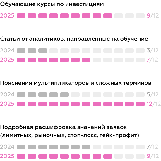 Оценка за год в блоке заач, связанных с обучением, увеличилась на 14 баллов. Брокеры стали активнее помогать пользователям разобраться с нюансами: