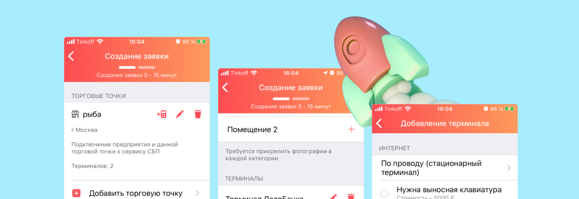 При подключении торгового эквайринга есть подробная информация о разных терминалах и тарифах, можно добавить адреса и контактные данные точек, указать тип и требуемое число торговых терминалов, выбрать тарифный план и способ оплаты, быстрое оформить доставку и заказать онлайн-кассу с фискальными накопителем.