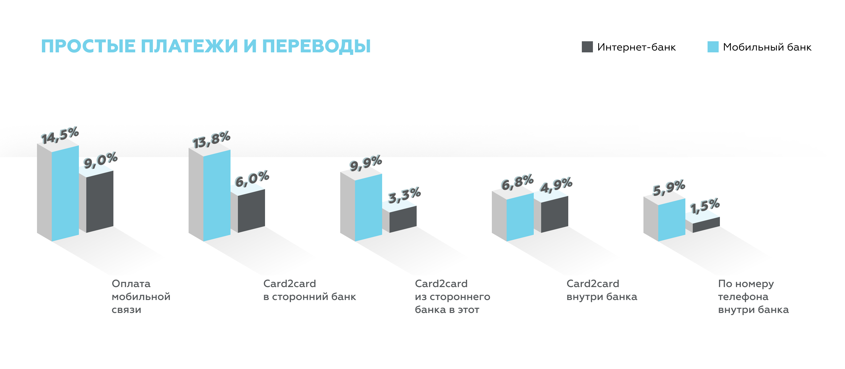 Результаты Digital Banking Benchmark 2019 показывают, что клиенты чаще используют мобильные банки для оперативных переводов и платежей, связанных с повседневной активностью — оплата услуг связи, переводы между своими счетами и на карты частных лиц.