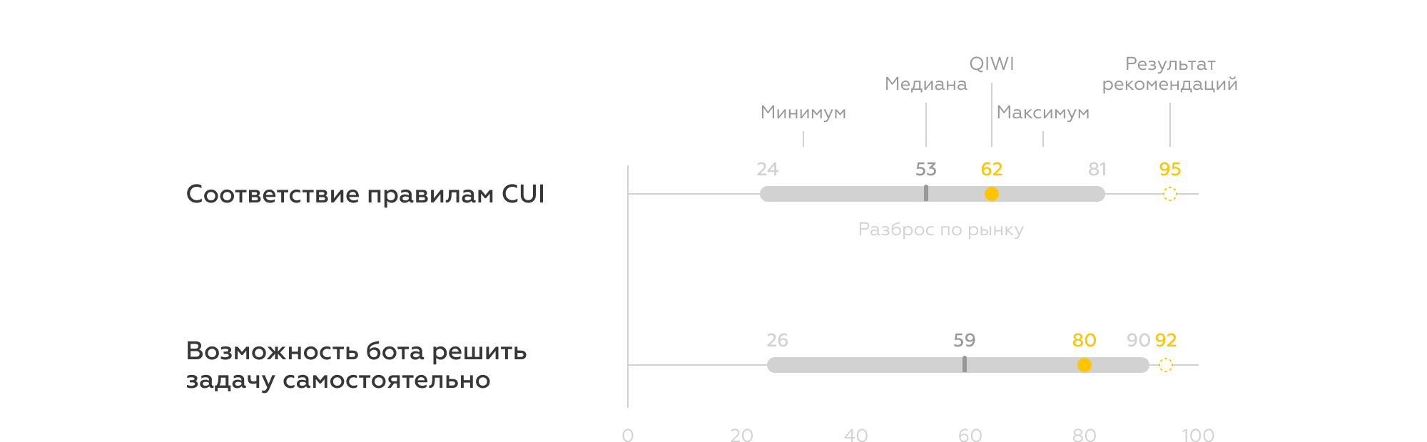 Всего исследователи описали для QIWI 18 зон роста, к каждой подобрали от 2 до 5 рекомендаций по улучшению UX. Решений выбирали среди практик чат-ботов из финтех-приложений и e-commerce сферы — всего более 40 реализаций для соответствия каждому принципу CUI.