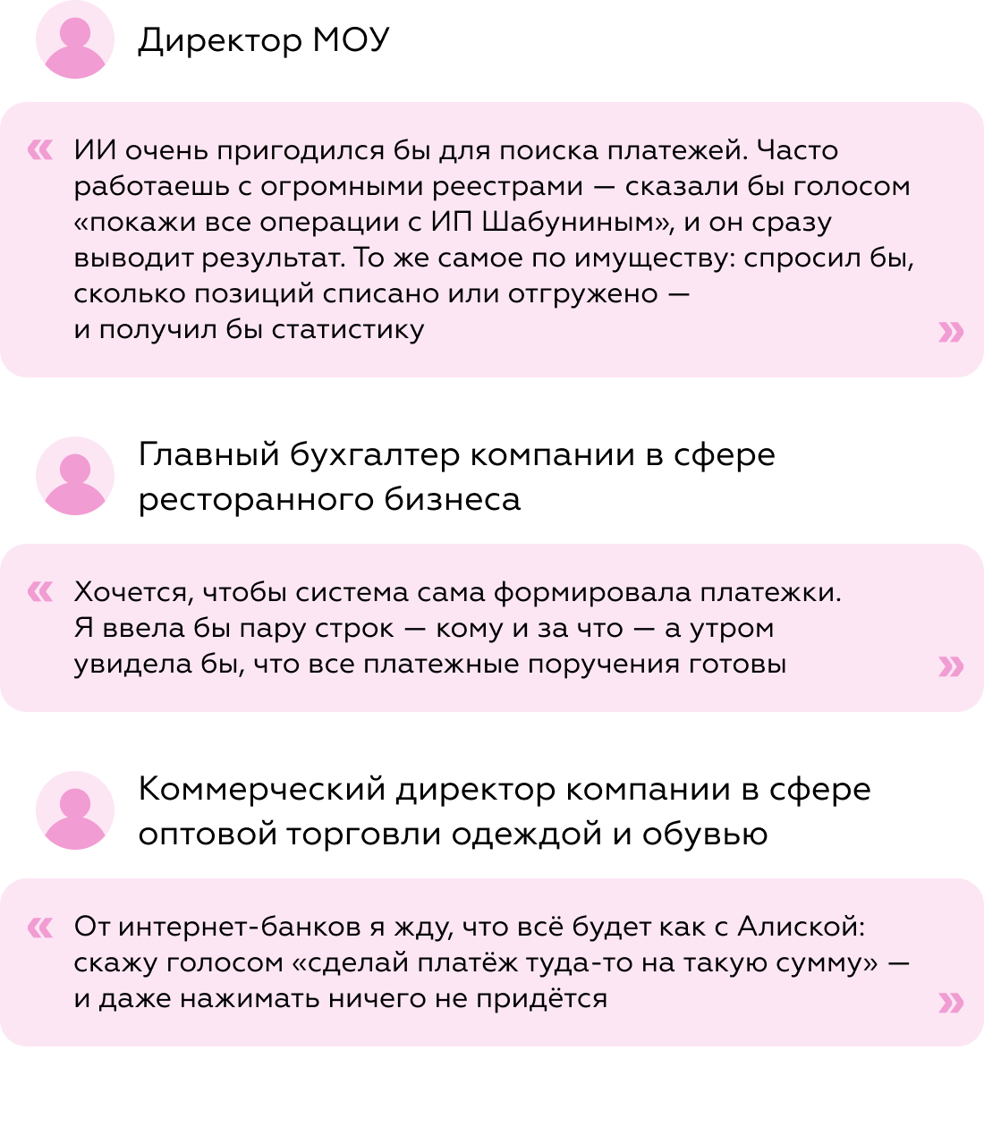 Современный банк должен обеспечивать качественный UX не только для разных типов компаний, но и для разных ролей внутри них. Традиционный взгляд «клиент = компания» уже недостаточен: в интернет-банк заходят люди с разными задачами — руководители, бухгалтеры, фрилансеры. Они ожидают, что интерфейс будет подстроен под их рабочий контекст и не будет перегружен лишним функционалом.