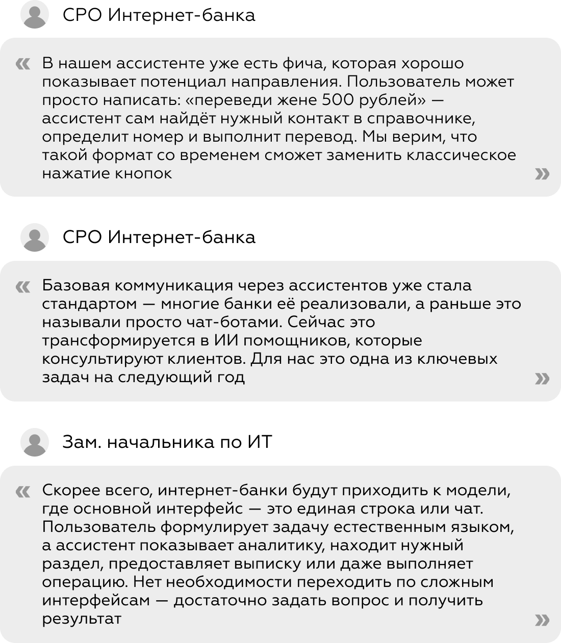 Рынок в долгосрочной перспективе движется к концепции «банка одной строки». По мнению всех экспертов, с которыми мы проводили интервью, интернет-банк будет эволюционировать в сторону формата, где пользователь взаимодействует с системой через простые однострочные команды или запросы — без сложной навигации и многошаговых сценариев.