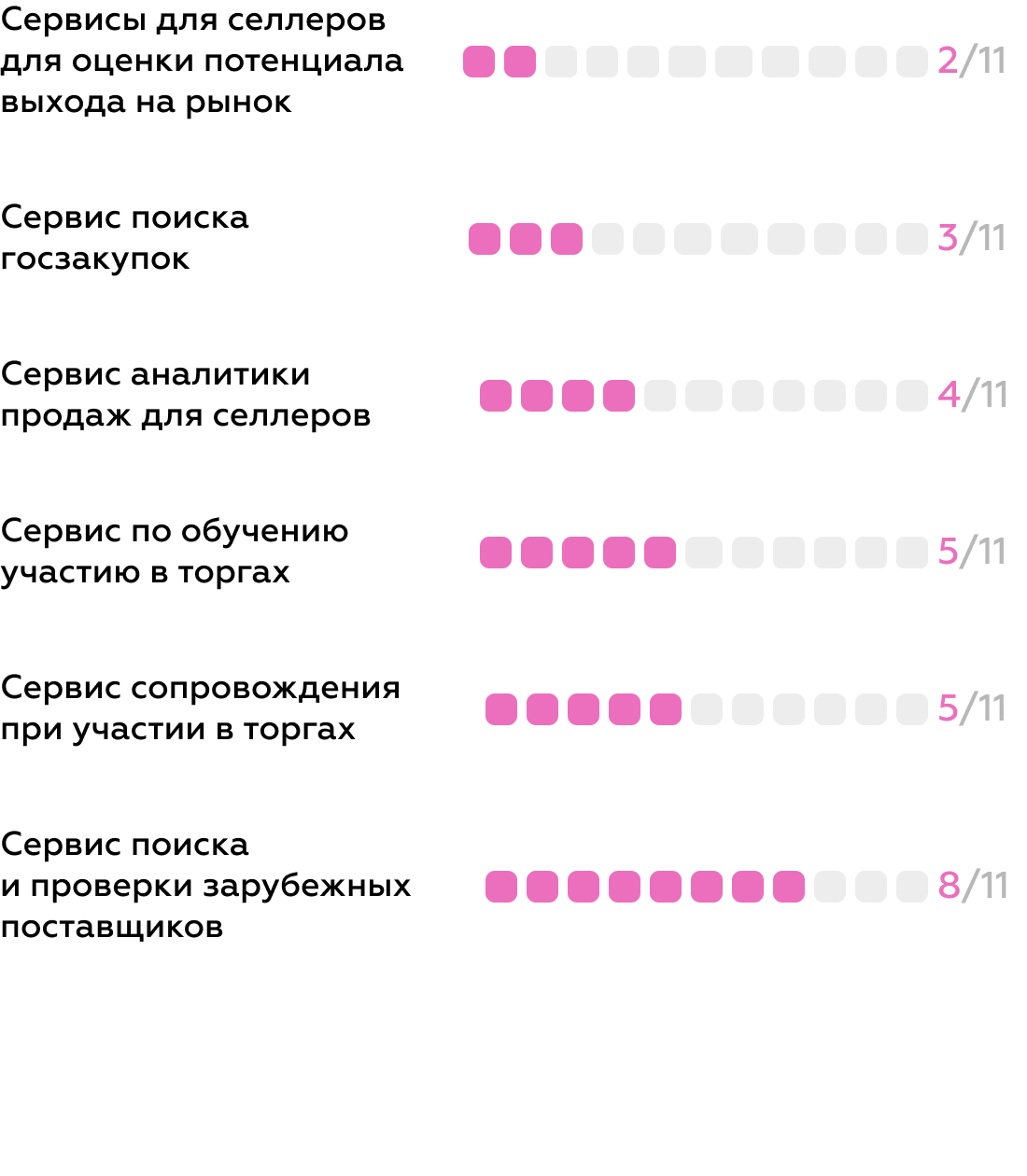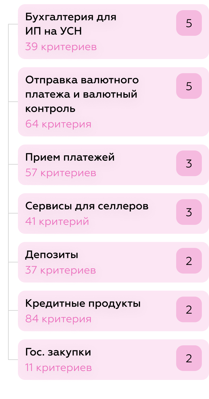 В 2024 году мы добавили 42 критерия для оценки функционала сервисов для селлеров, в этом году — ещё 11 критериев для оценки функционала по работе с госзакупками. Также в системе оценки мы рассматриваем сервисы для ВЭД — их развивают большинство банков.