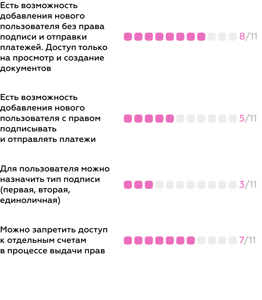 Функциональность оказалась невостребованной: мы видим это по уровню реализаций ролевых моделей на рынке и по инсайтам от пользователей — большинство компаний продолжают работать в интернет-банке с одного аккаунта, а также руководители не готовы тратить время на настройку и выдачу доступов.