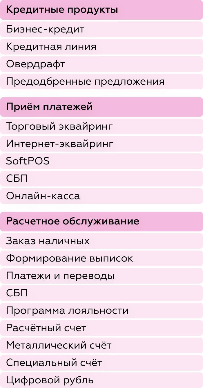- позволяют онлайн открывать дополнительные продукты без визита в офис: эквайринг, дополнительные счета, карты, депозиты и кредиты.