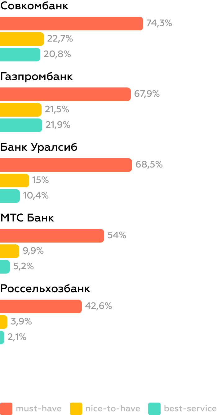 Задача банков с широкой линейкой (40+ сервисов в ИБ) — довести весь must-have функционал до 100% уровня, а затем инвестировать в nice-to-have.