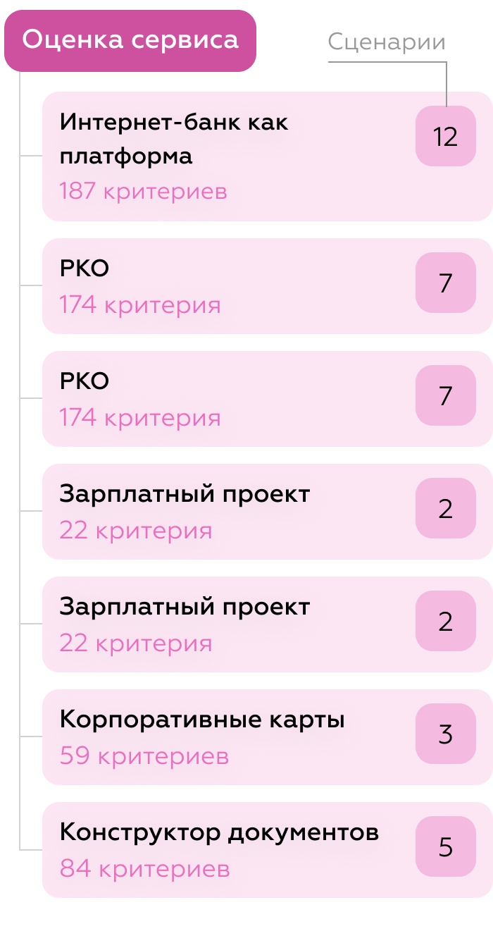 В каждом сервисе мы проходим 53 пользовательских сценария и заполняем чек-лист из 859 критериев. Фиксируем лучшие практики, точки роста, особенности и преимущества реализаций.