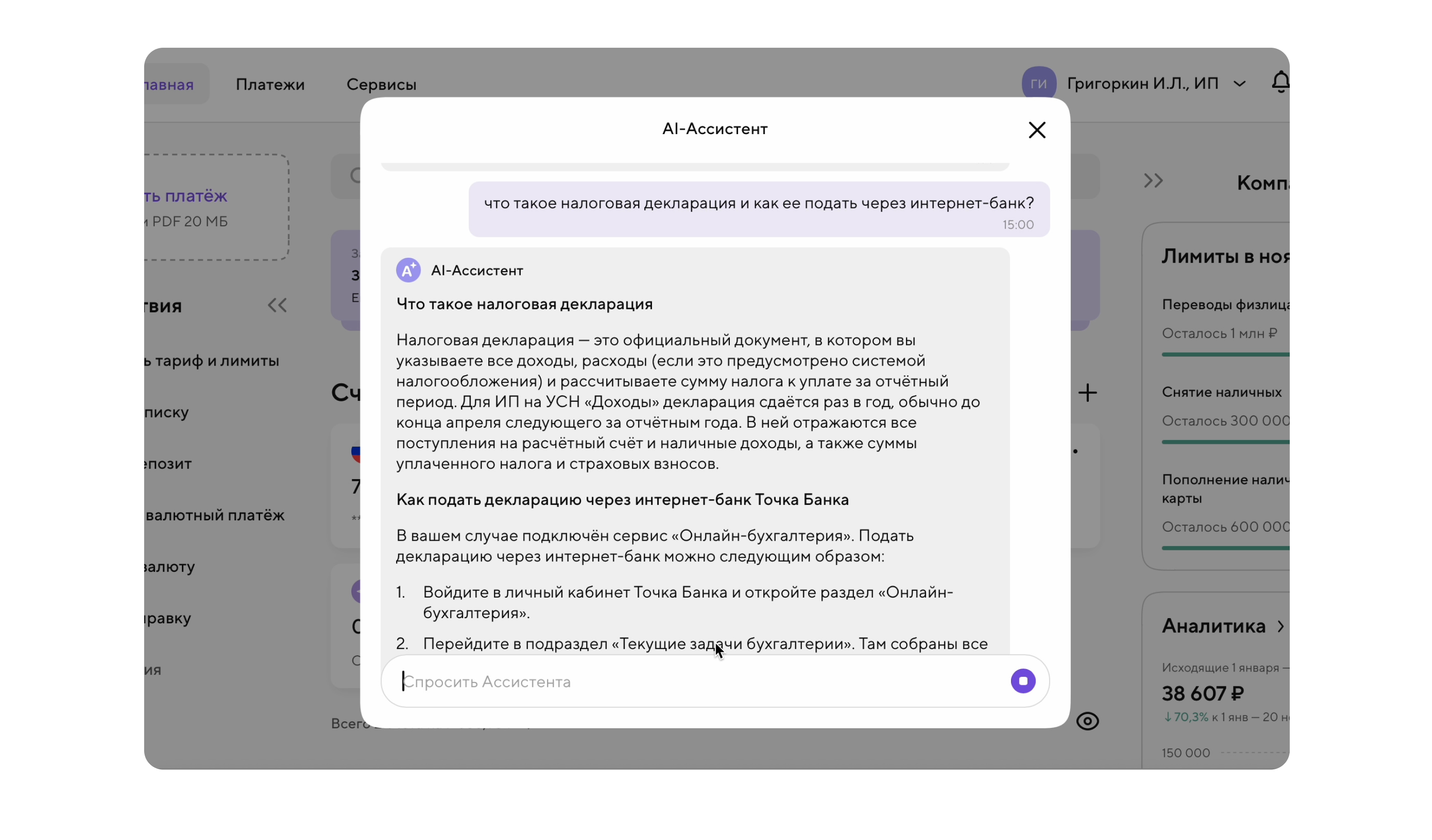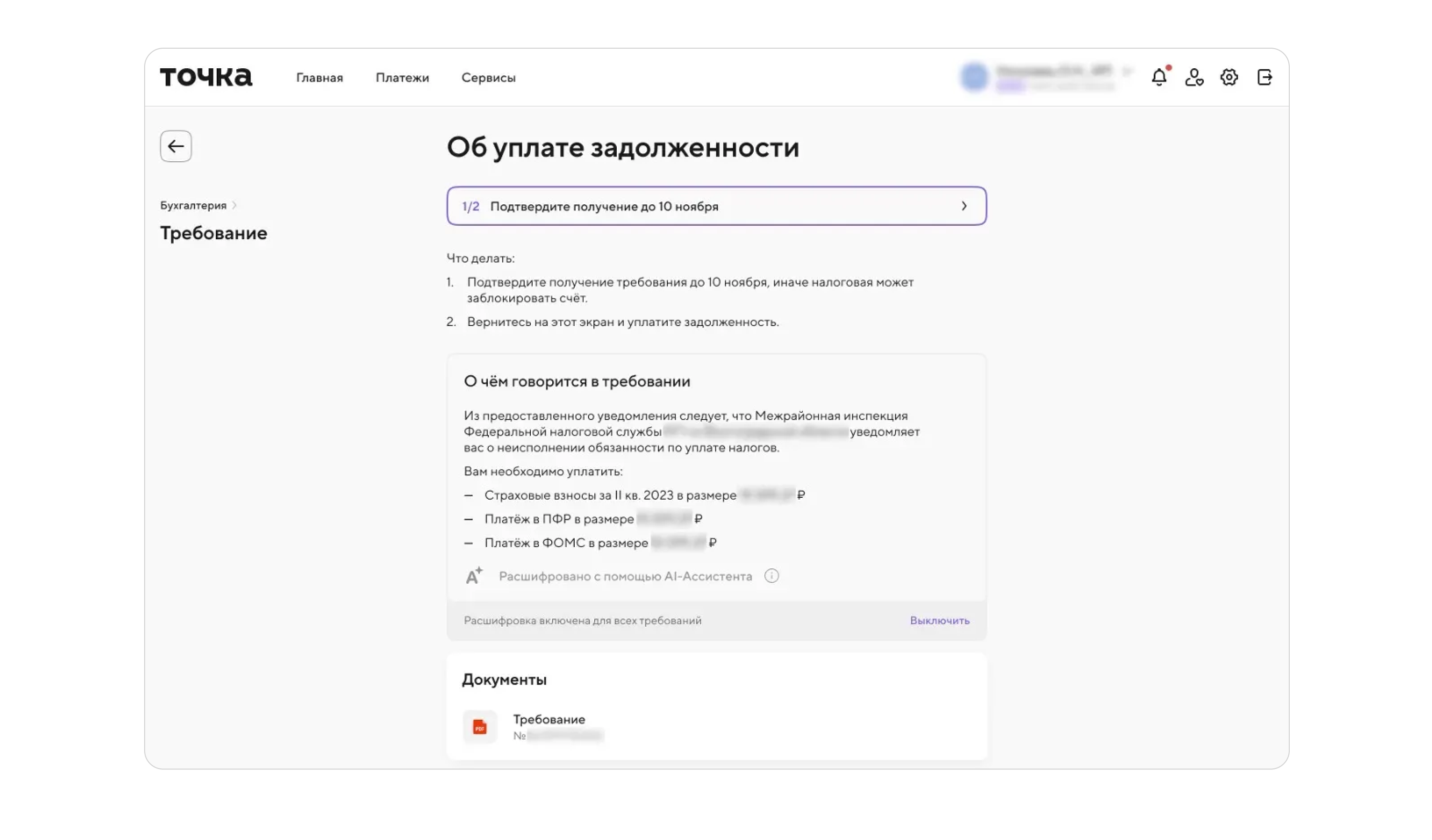 Показательный пример — интернет-банк Точки: онлайн-бухгалтерия автоматически анализирует документы от ФНС и за несколько секунд пересказывает их простыми словами с помощью ИИ, избавляя пользователей от необходимости разбираться в сложных формулировках.