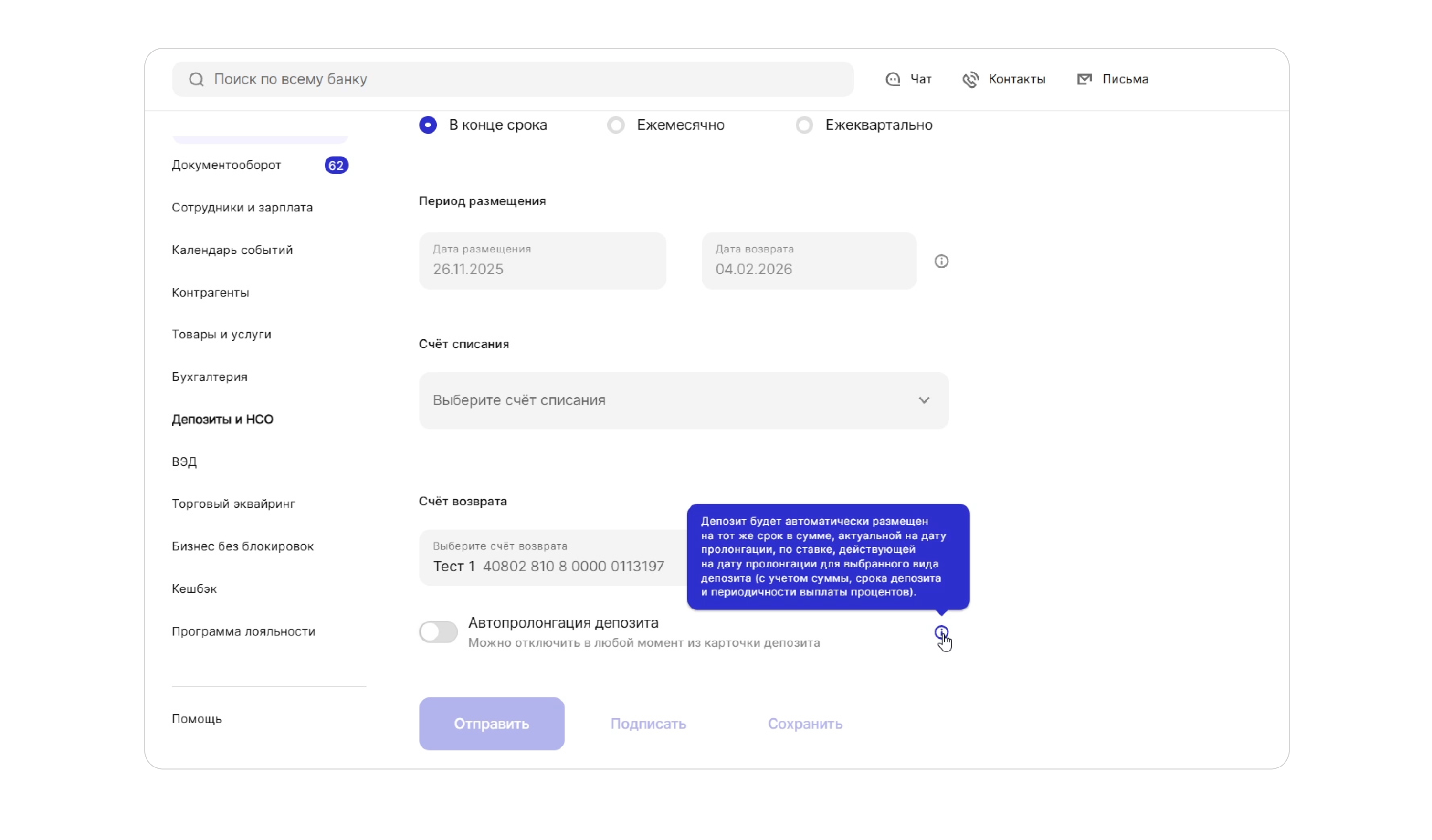 ПСБ максимально упрощает рутину: в форме заявки на депозит сразу можно подключить автоматическую пролонгацию — уникальная реализация на рынке. Эта опция снимает с пользователя необходимость отслеживать дату окончания вклада и продлевать его вручную, исключает паузы в начислении процентов и особенно удобна при работе с несколькими депозитами.