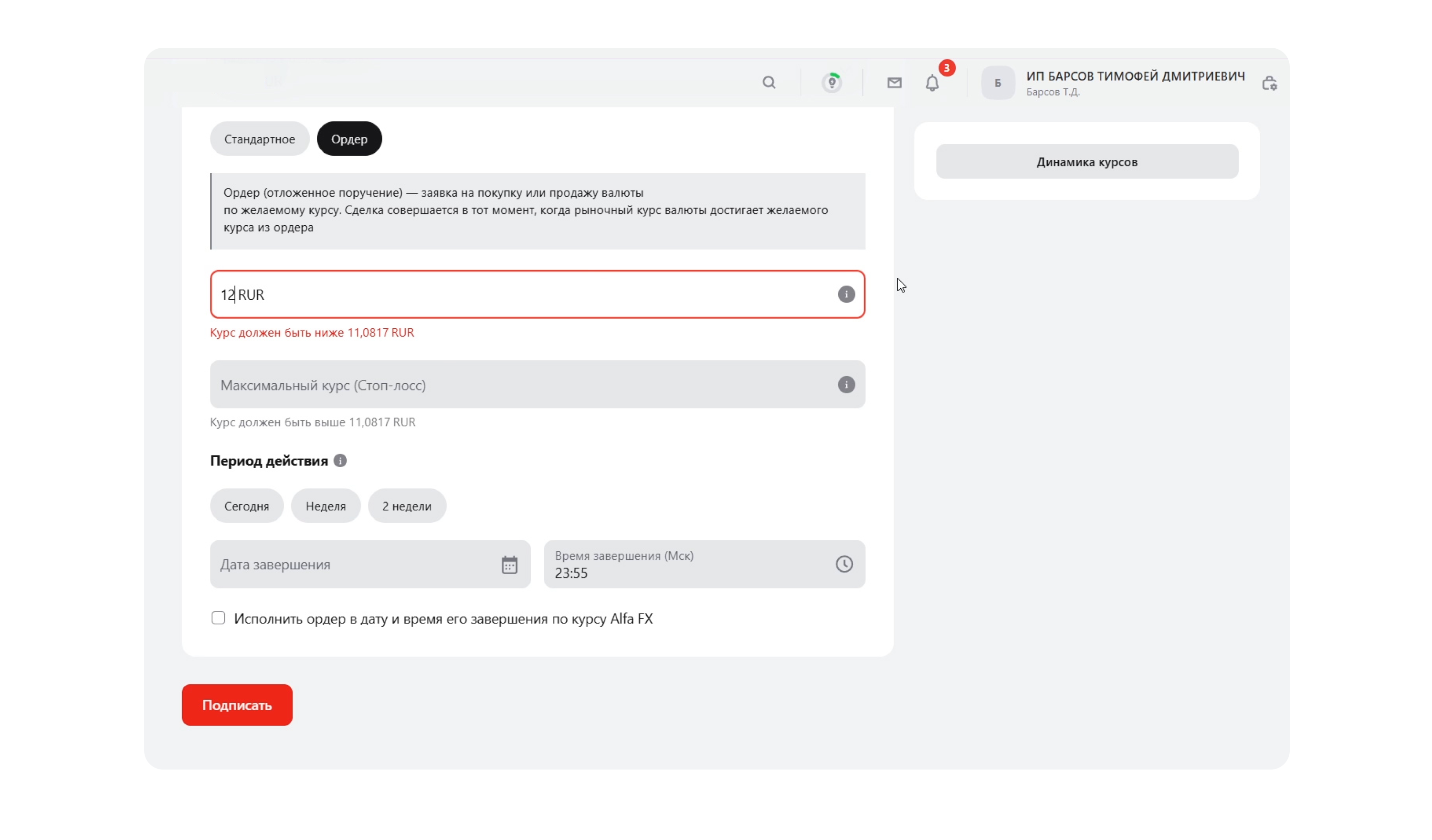 В Альфа-Банке заявка может быть бессрочной — остаётся активной до достижения заданного курса или ручной отмены, без ограничения по сроку, что снимает необходимость следить за рынком. Дополнительно система не позволяет указать курс хуже текущего рыночного, то есть ордер всегда привязан к биржевому курсу и не допускает заведомо невыгодных условий. Сейчас бессрочные ордера есть у 1 из 11 банков, а ограничение на указание курса ниже рынка — у 2 из 11.