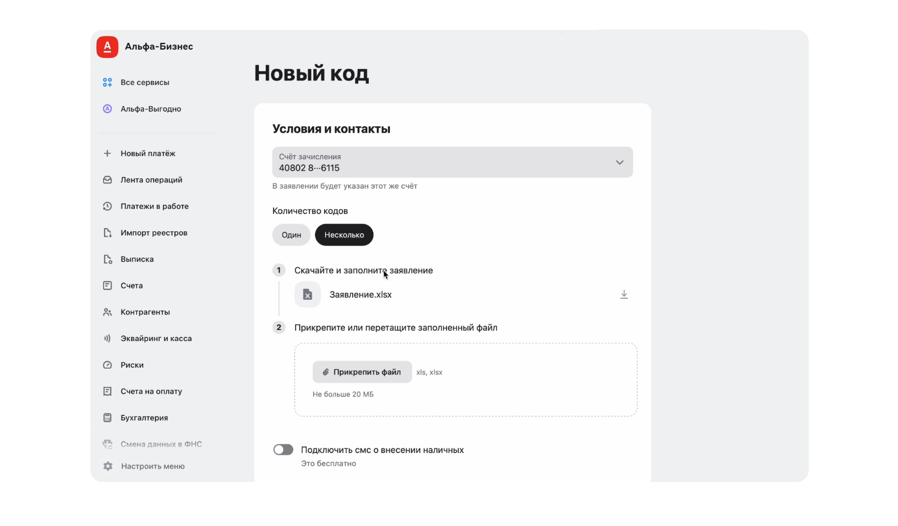 Коды выпускаются мгновенно, можно создать сразу несколько, подключить бесплатные SMS-уведомления о внесении наличных. Интерфейс управления поддерживает гибкую настройку: фильтрацию по статусу, счёту, телефону и SMS, возможность скрывать лишние фильтры и закреплять нужные столбцы. Любой код при необходимости можно деактивировать, отчёт по кодам выгружается в Excel — как полностью, так и по выбранным позициям. На странице сервиса есть раздел помощи (FAQ) с ответами на ключевые вопросы.