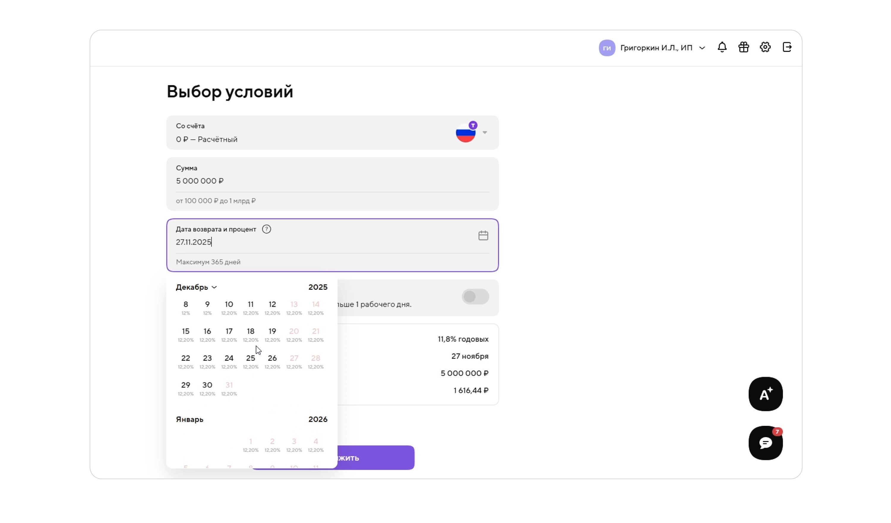 Точка упрощает выбор условий депозита: ставка сразу отображается в календаре для каждой доступной даты. В большинстве банков процент и доходность видны только после выбора срока, здесь же пользователь получает эту информацию на шаг раньше. Это заметно сокращает время принятия решения и делает условия депозита более предсказуемыми.
