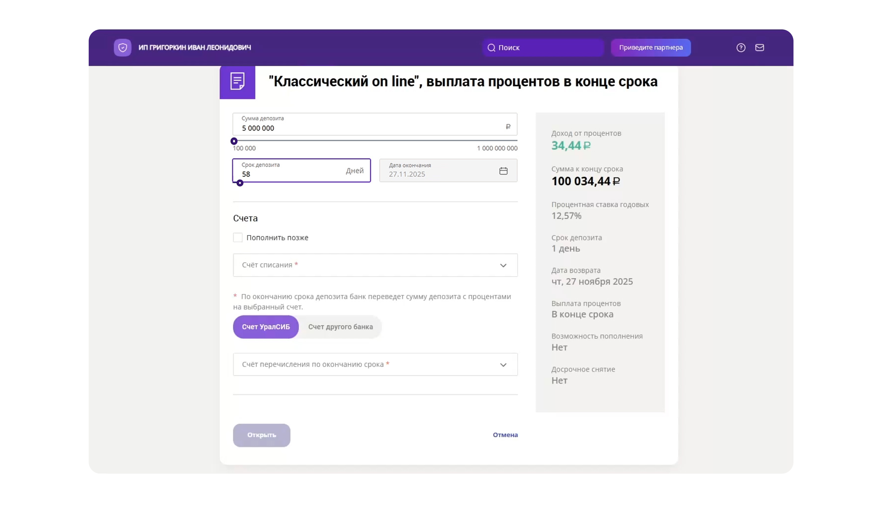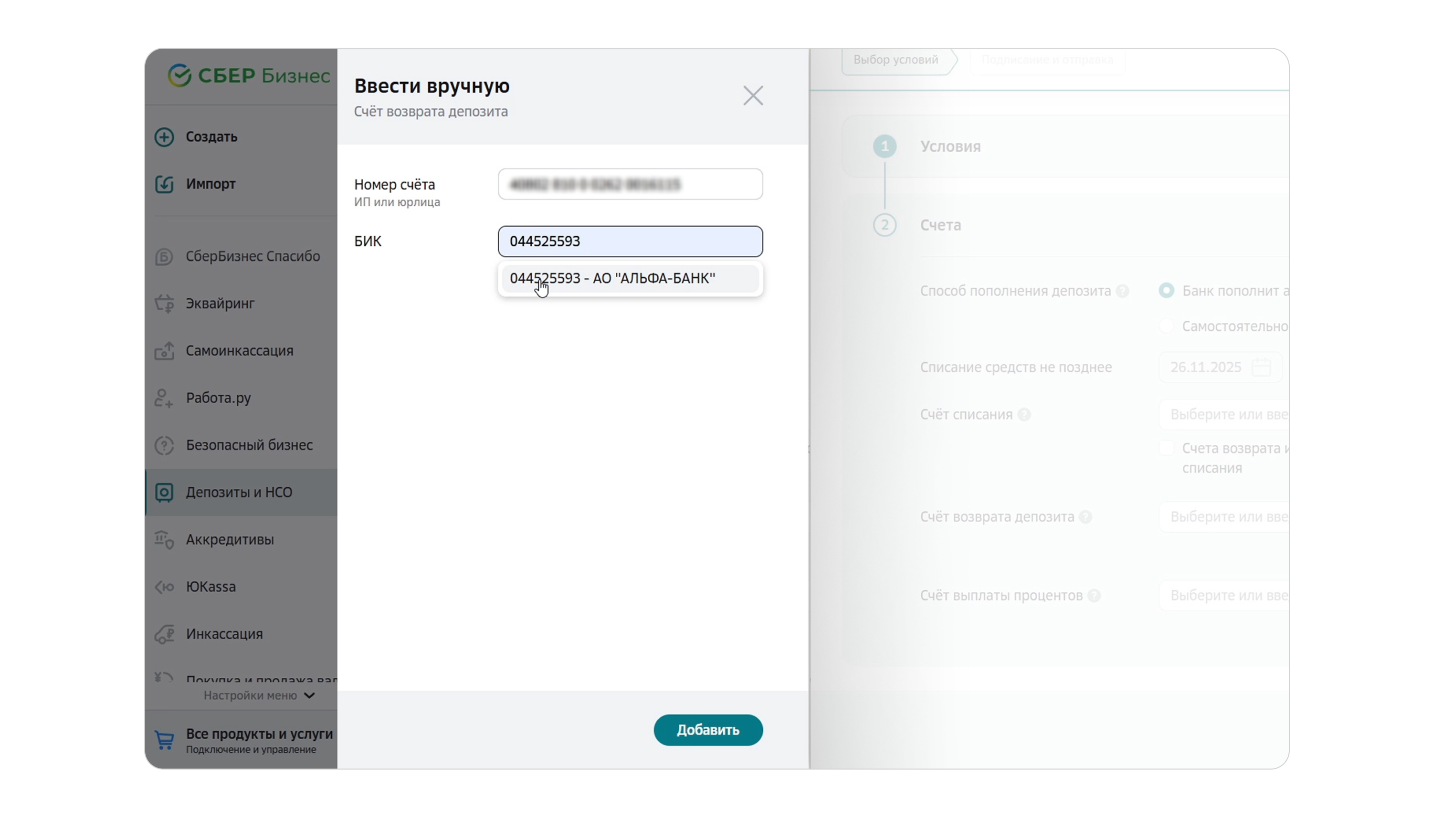 Возможность выбрать счет другого банка для списания суммы или начисления процентов в заявке на депозит есть у 6 из 11 банков. В Сбере пользователь может указать любые внешние счета и даже настроить это отдельно дял разных типов операций. Это удобно компаниям, которые ведут расчёты через несколько банков и распределяют обороты между разными счетами.