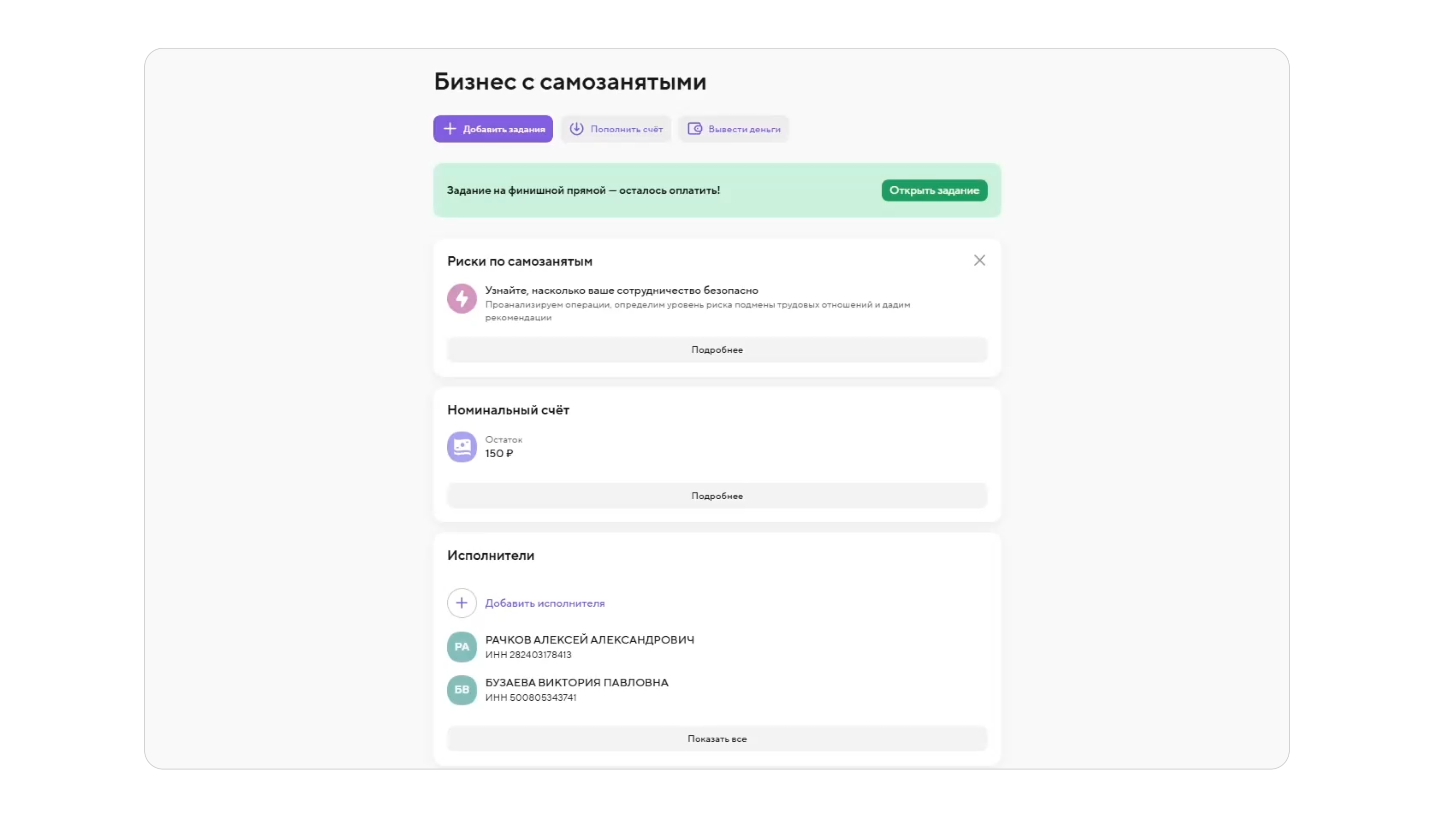 Быть уверенным, что самозанятый сохраняет свой статус >> проверка встроена в процесс добавления самозанятого: система сразу идентифицирует статус и блокирует добавление обычных физлиц.