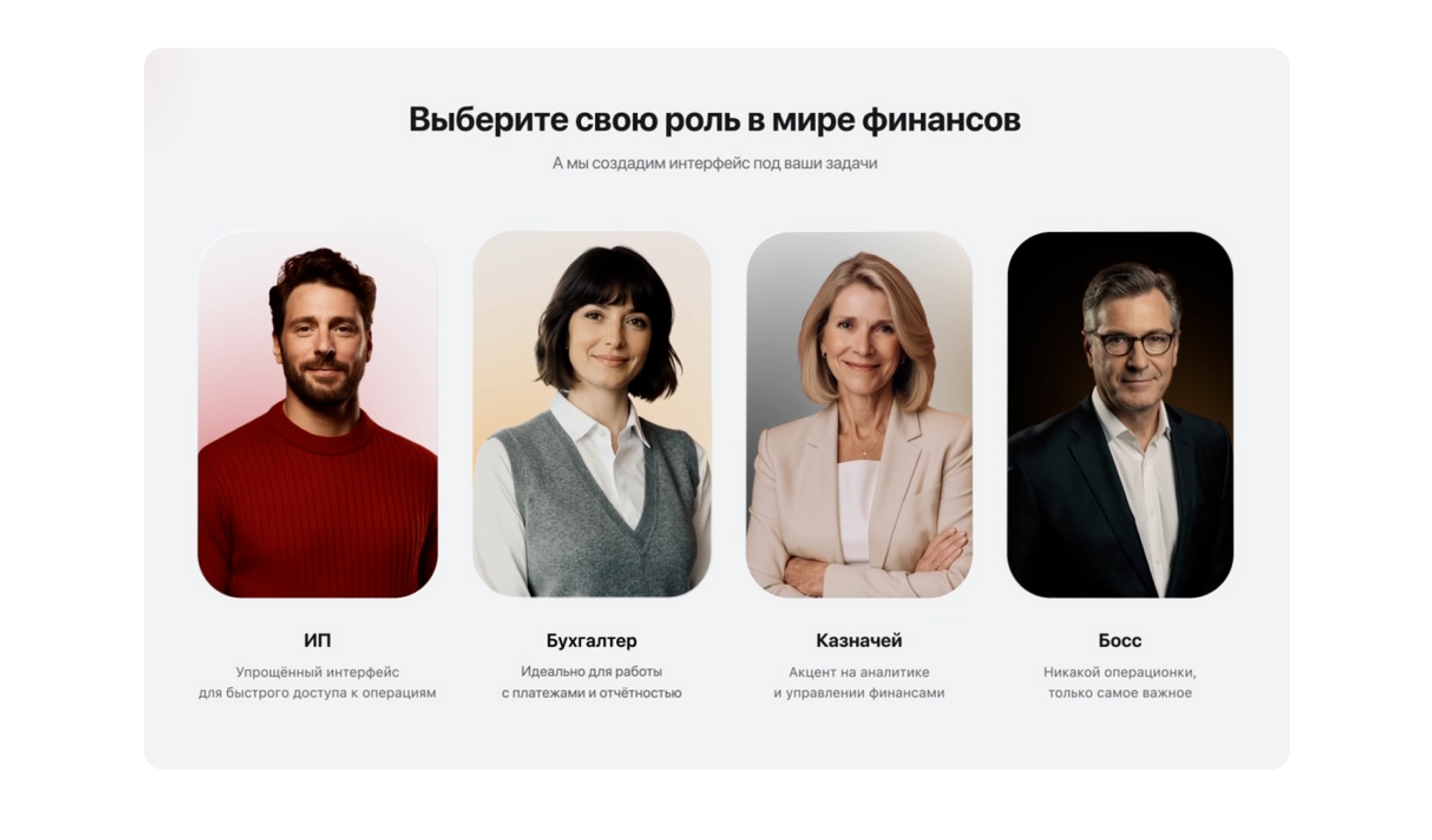 Альфа-Банк анонсировал иной подход. Пользователь выбирает своего «персонажа» — ИП, бухгалтер, казначей, руководитель — и главная страница автоматически формируется под задачи выбранной роли.