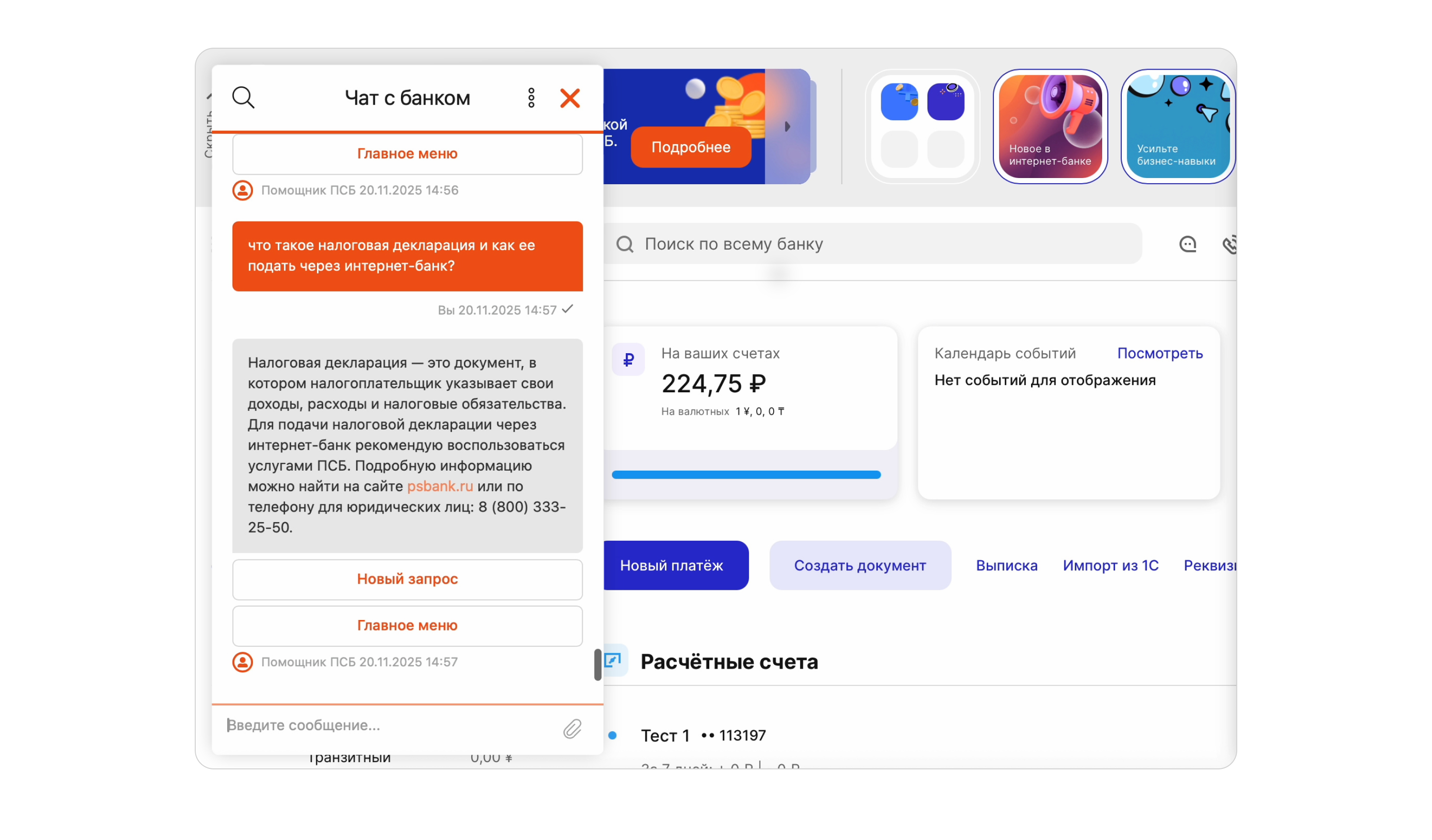 Разницу в качестве консультаций хорошо видно на задаче «сдать налоговую декларацию через интернет-банк». Ассистент на универсальной модели даёт лишь общую справку без привязки к конкретному пользователю, дате и возможностям интернет-банка. Ассистент на «банковской» модели учитывает контекст интернет-банка и пользователя и сразу навигирует его в нужный раздел бухгалтерии.