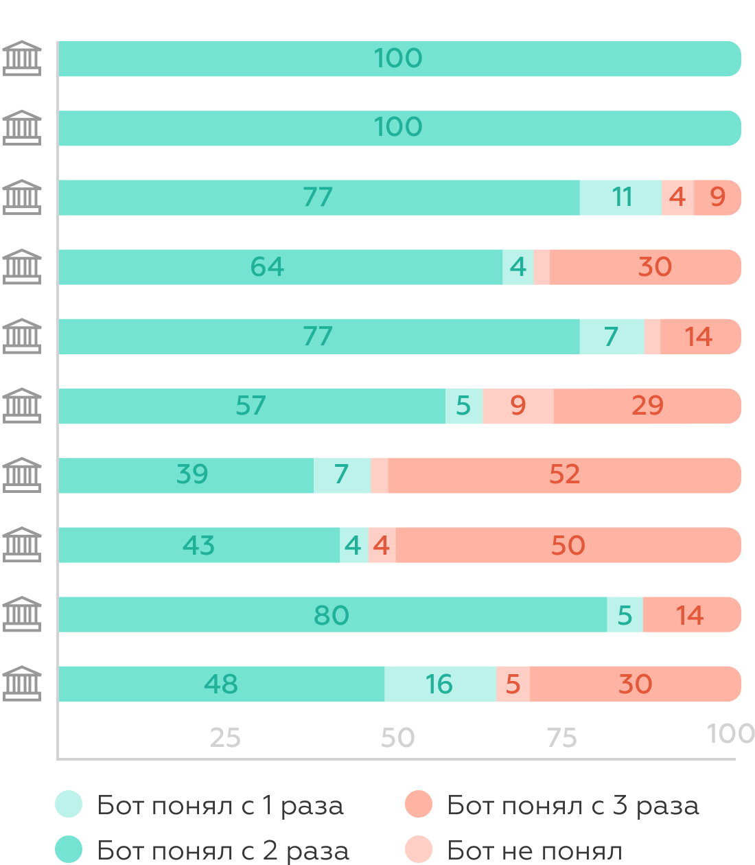 - Значительно улучшить точность распознавания запросов. Бот распознал с первой попытки только 27 из 56 запросов. У ближайших конкурентов показатели лучше примерно на 30%.