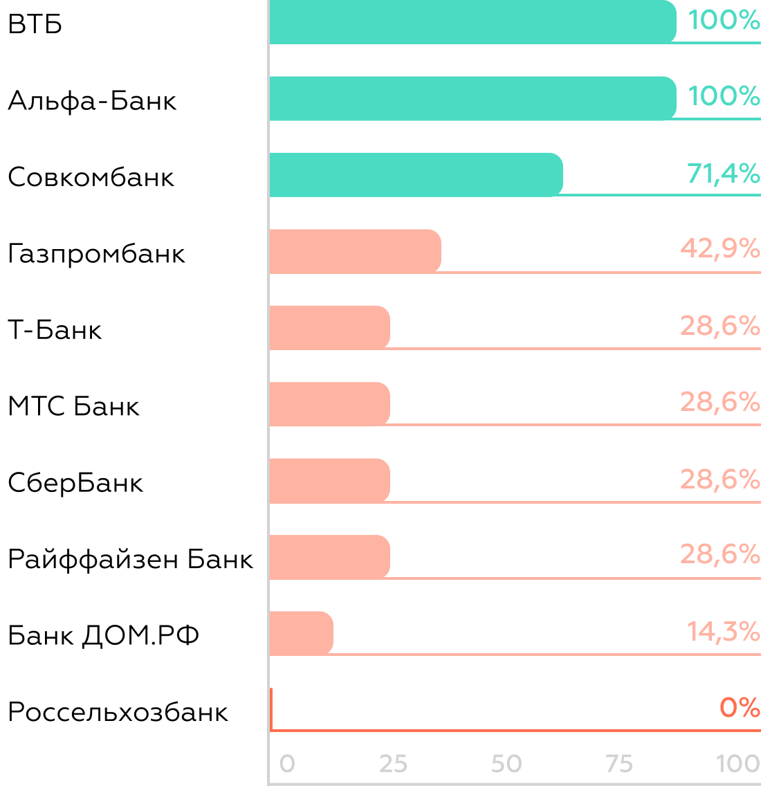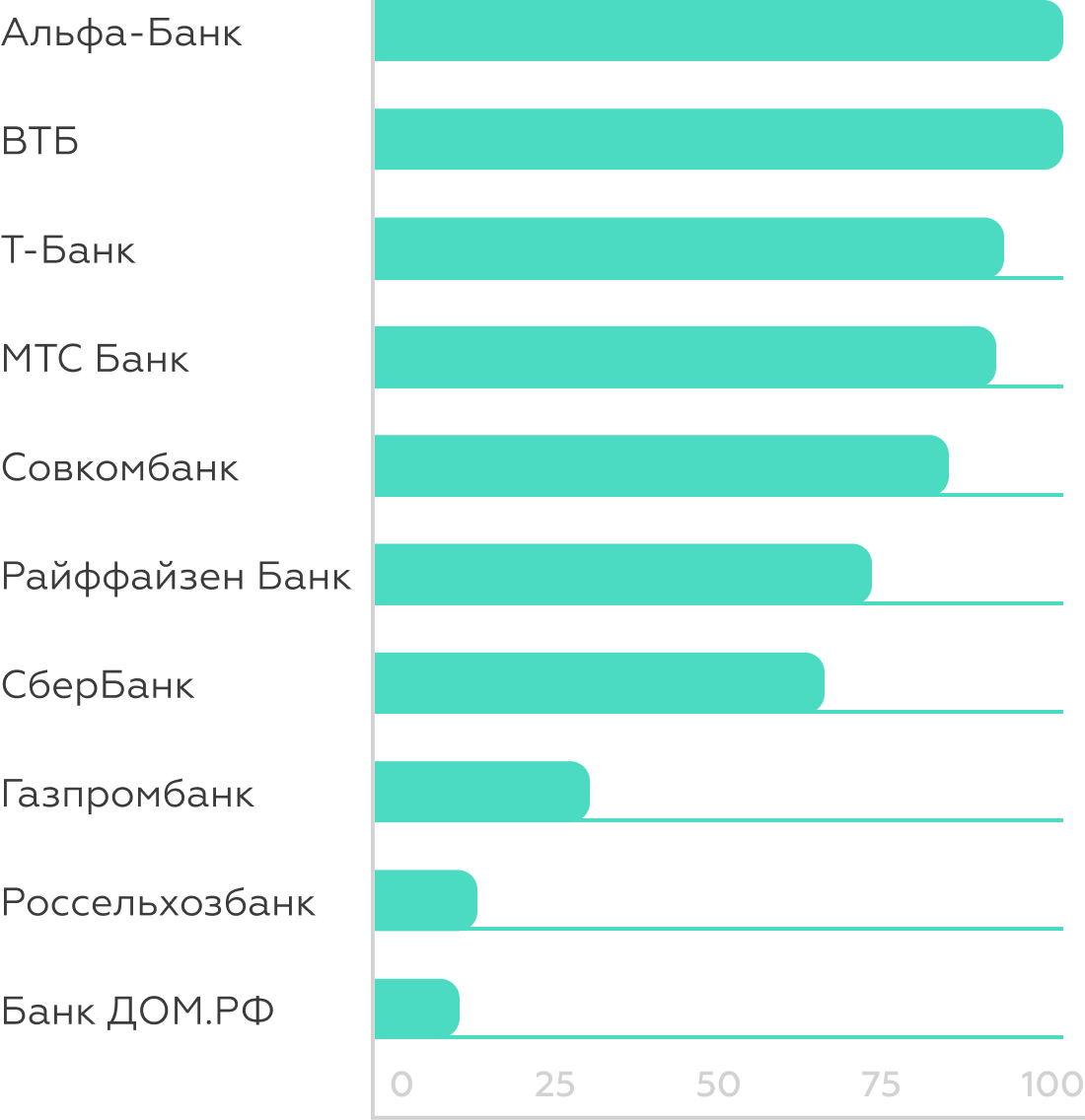 Лидеры рейтинга — Альфа-Банк и ВТБ — полностью закрывают потребность пользователей в персональной информации (комиссии за перевод, кредитная и дебетовая карты, вклад, подключённые услуги).