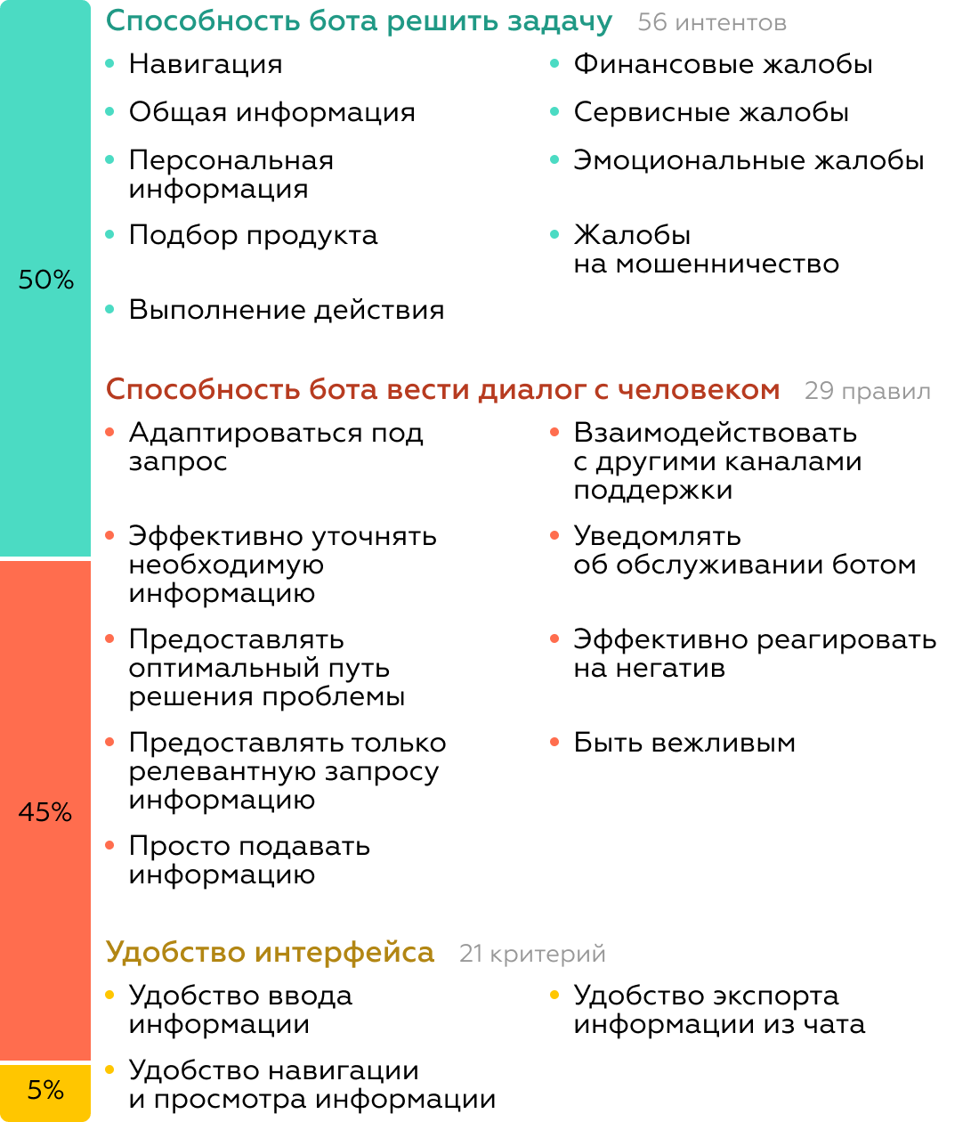 Система оценки бинарна: сценарий либо выполняется, либо нет. Кроме того, у каждого из них есть собственный вес, который присваивается на основании важности для пользователя и бизнеса. Мы последовательно фиксируем, насколько ведение диалога соответствует этим критериям качества — и получаем, таким образом, заполненные чек-листы по всем исследуемым ботам.