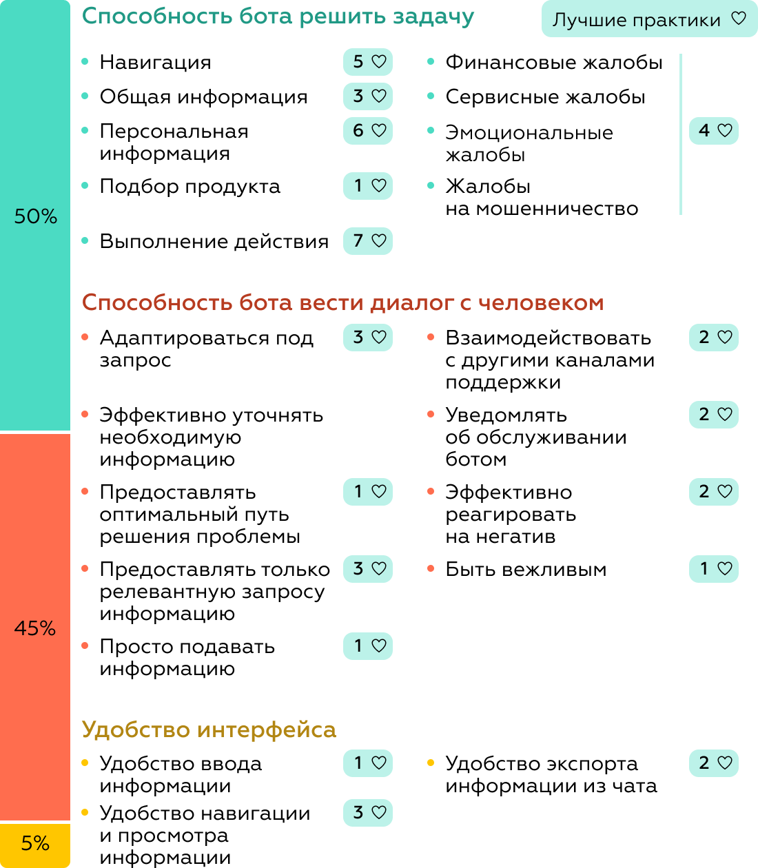 У каждого блока оценки есть лучшие практики, примеры, сравнение нескольких реализаций. Всего мы собрали 47 новых решений — они собраны в полном отчете. Любую их них можно брать в качестве референсов для развития собственных чат-ботов, к какой бы отрасли они не принадлежали.