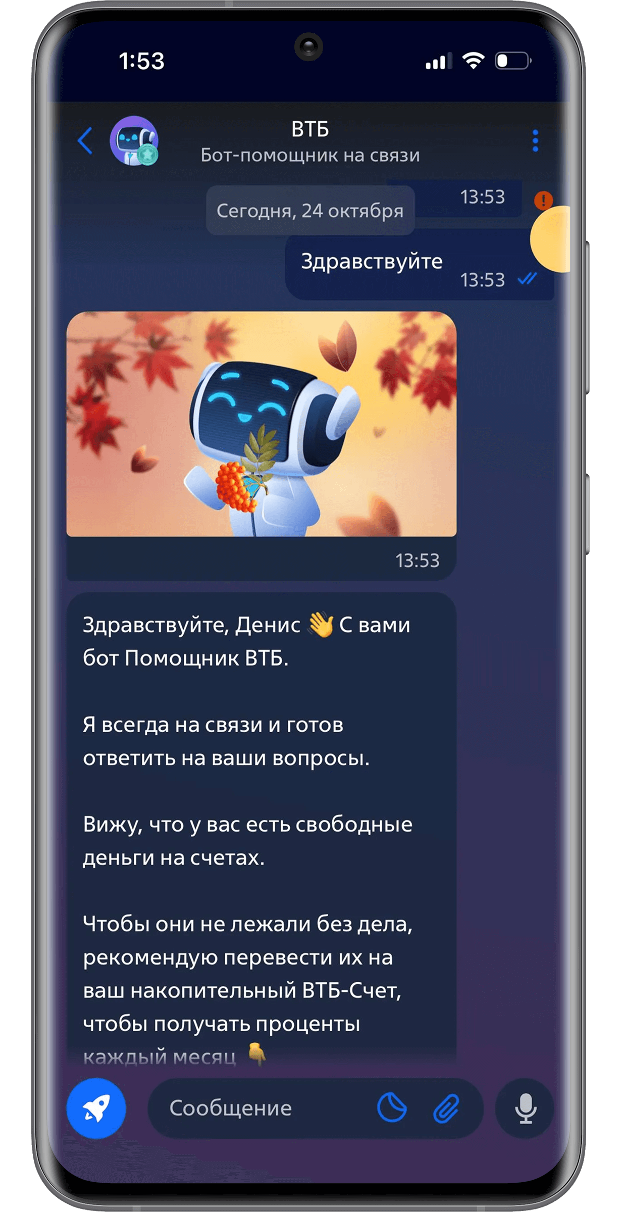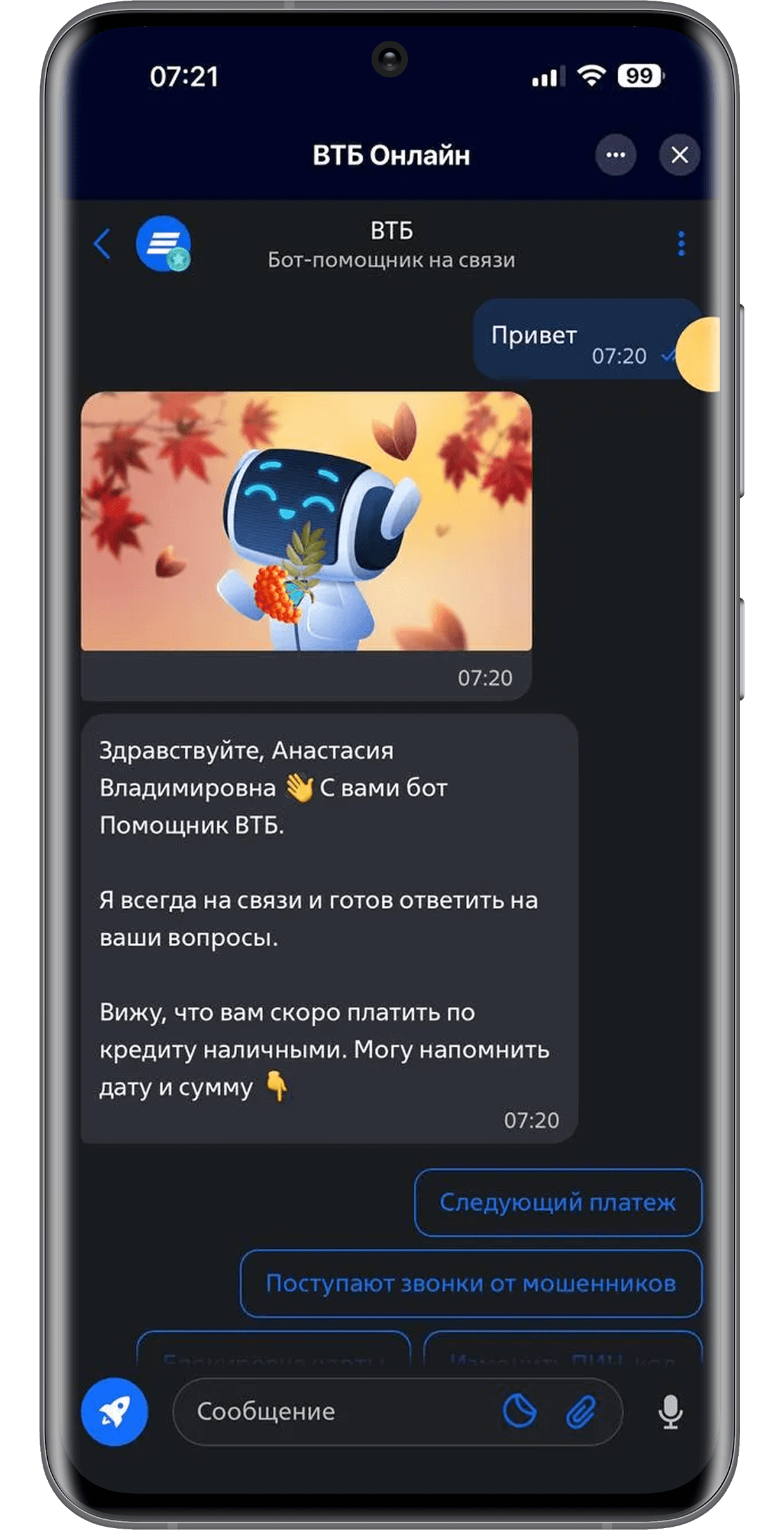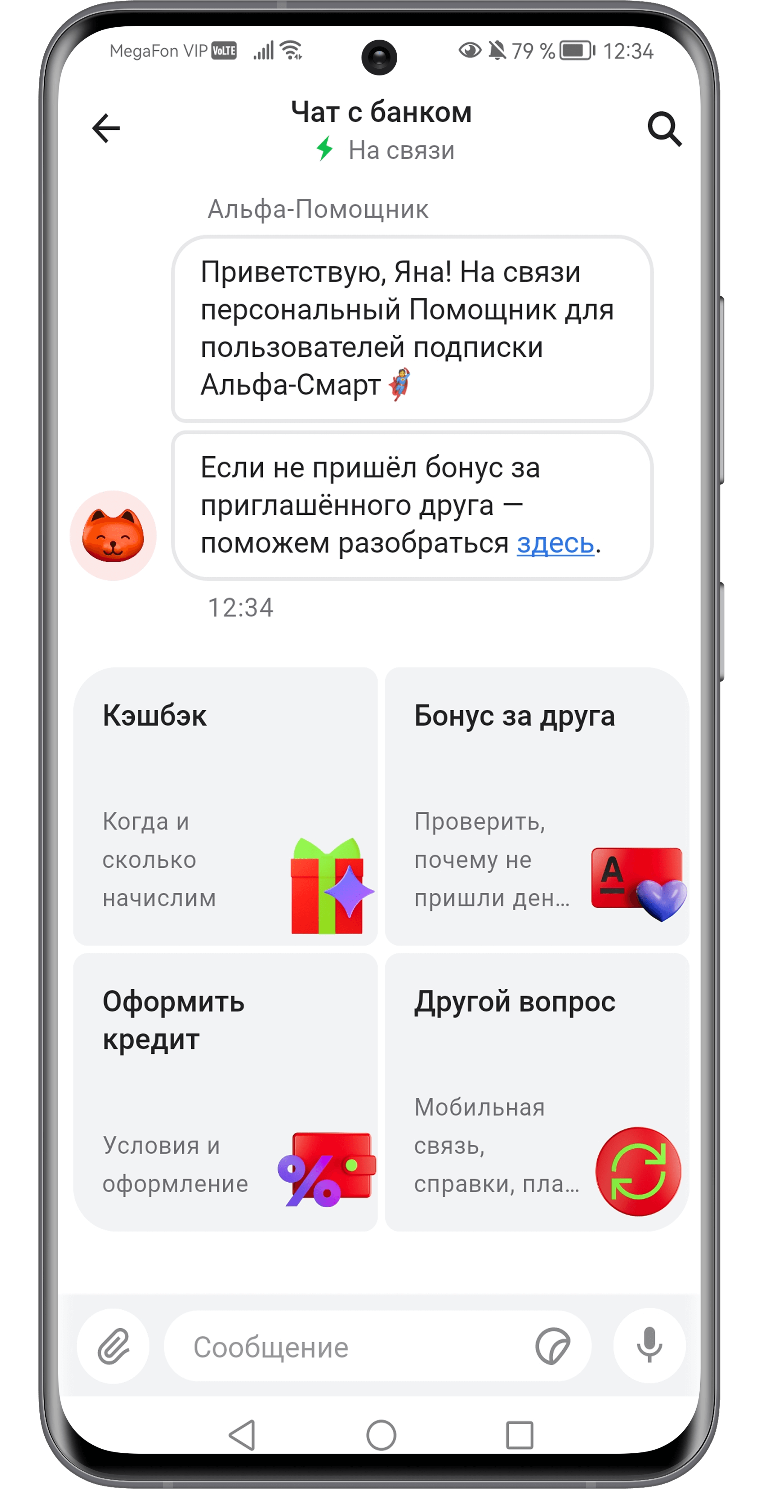 - Появление в чате проактивных уведомлений о кредитных и накопительных продуктах.