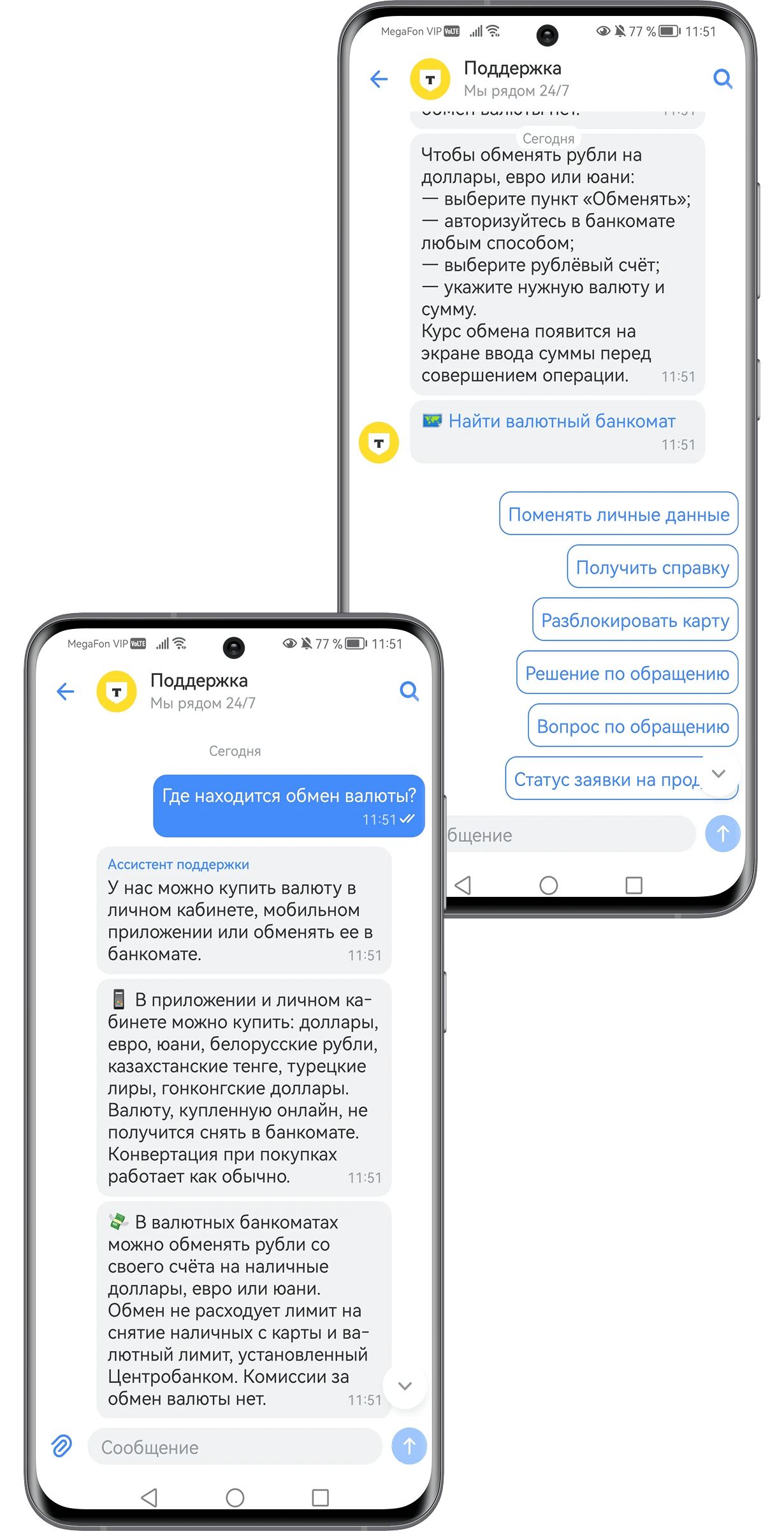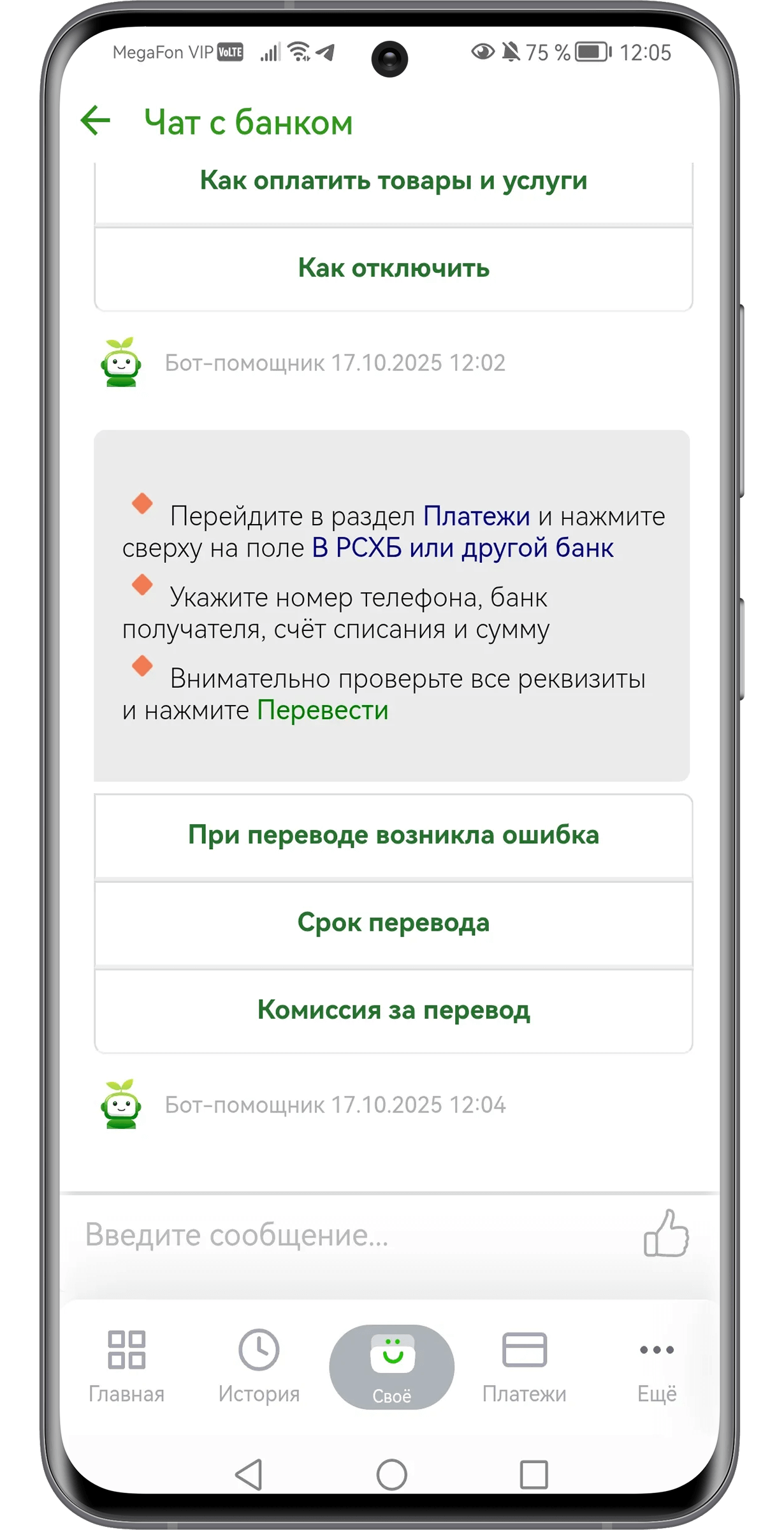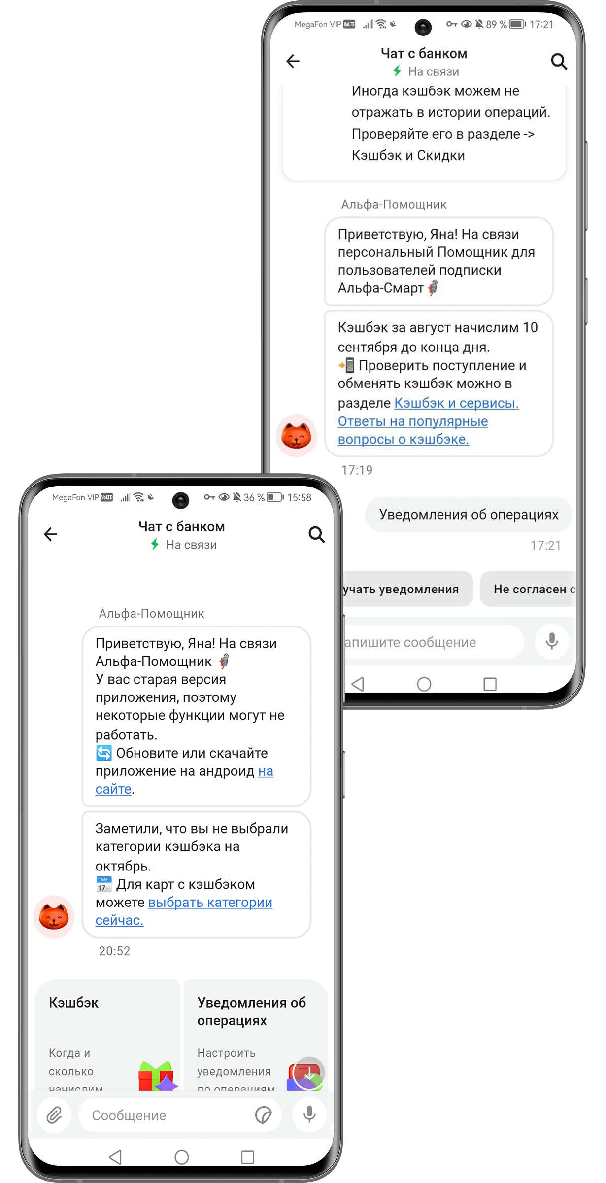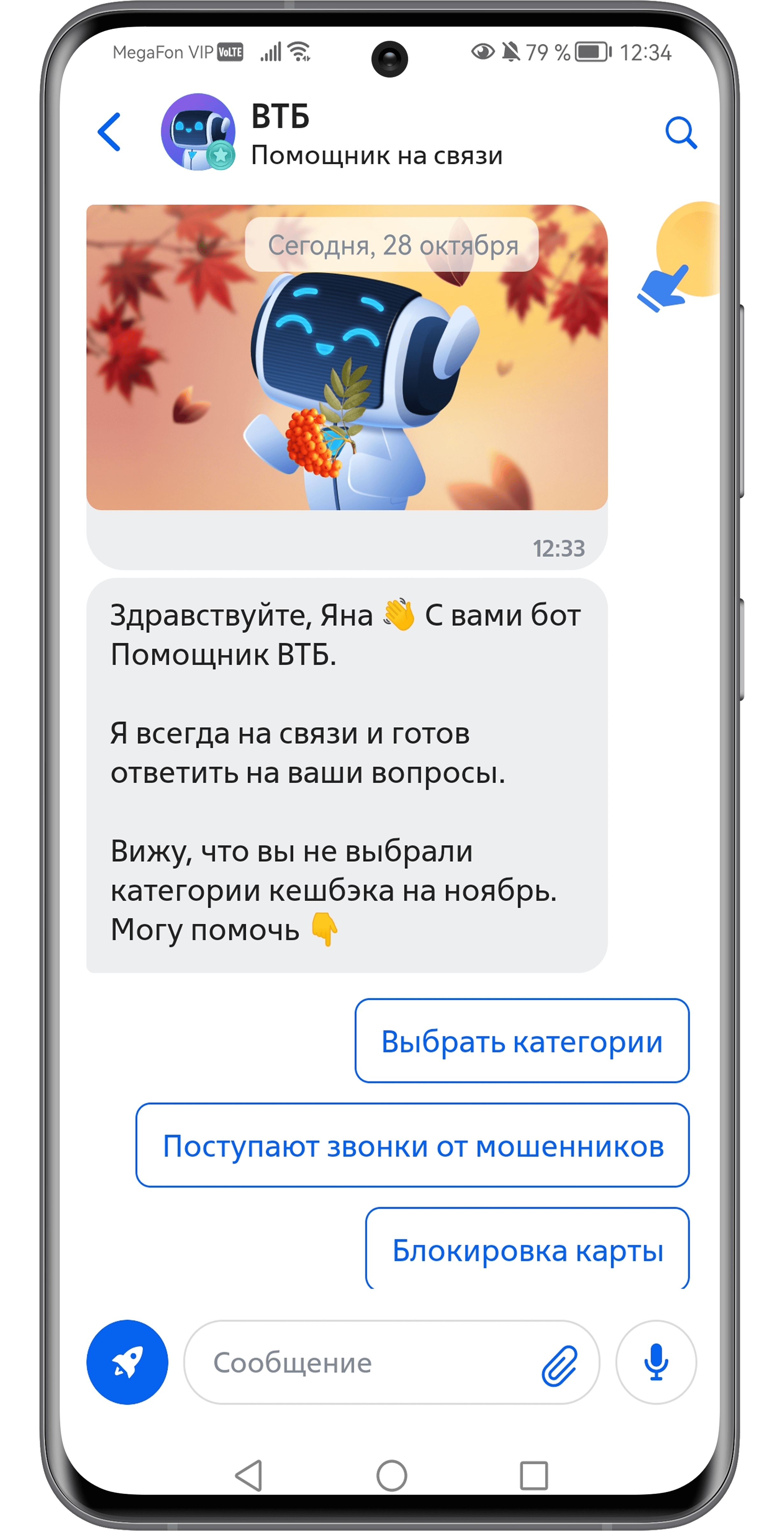 - Появление в чате проактивных уведомлений о кредитных и накопительных продуктах.