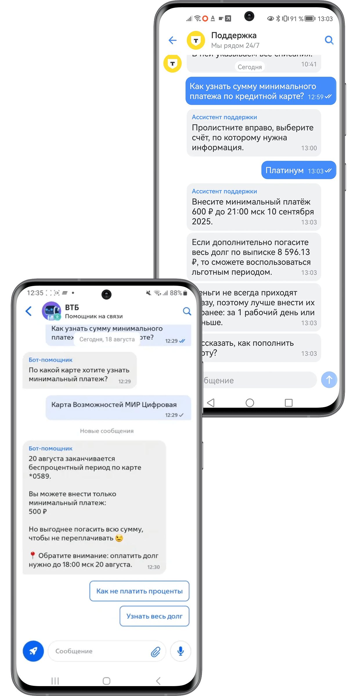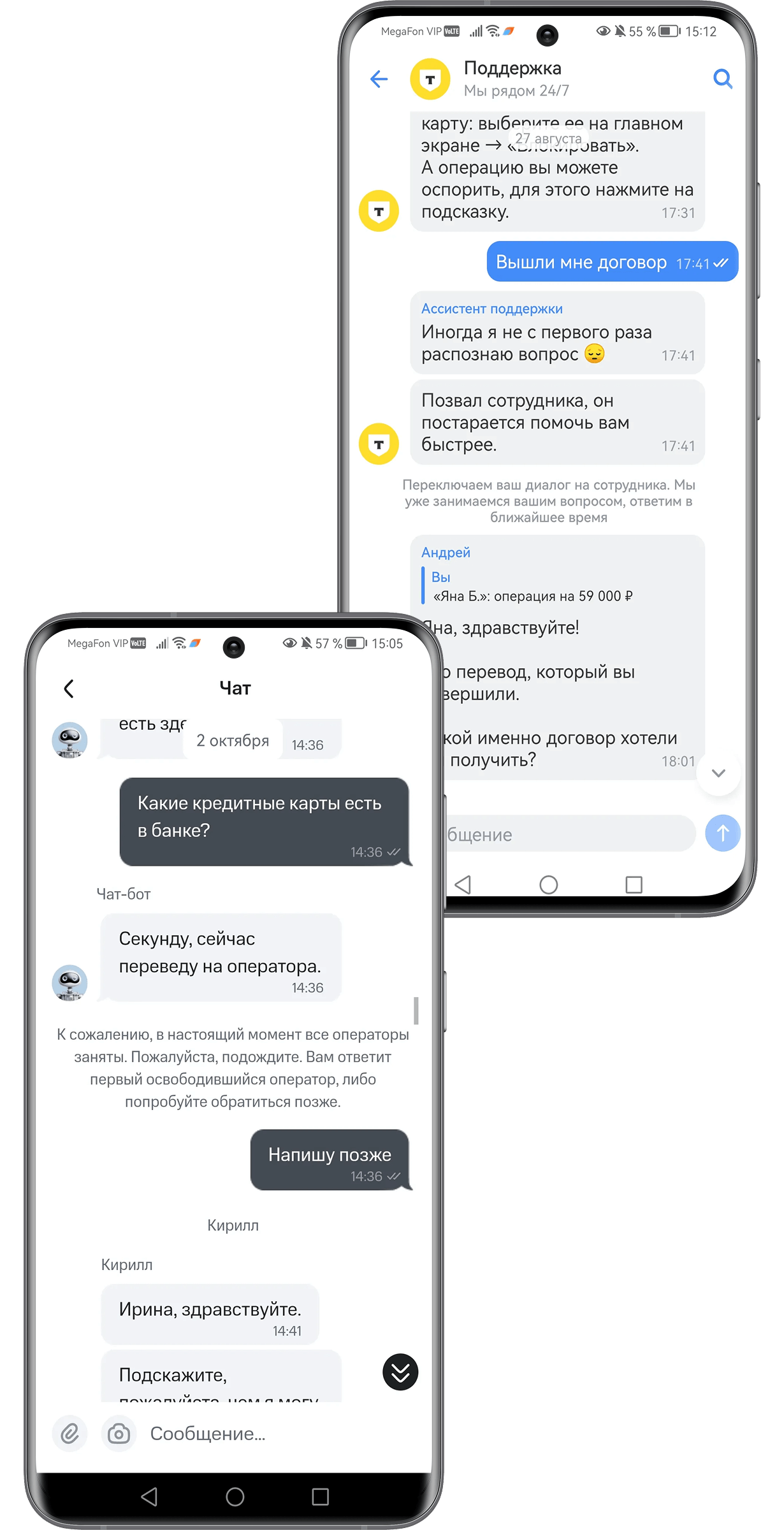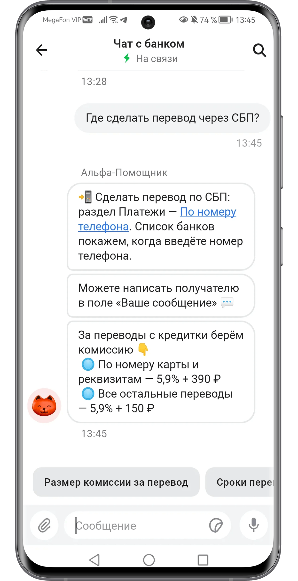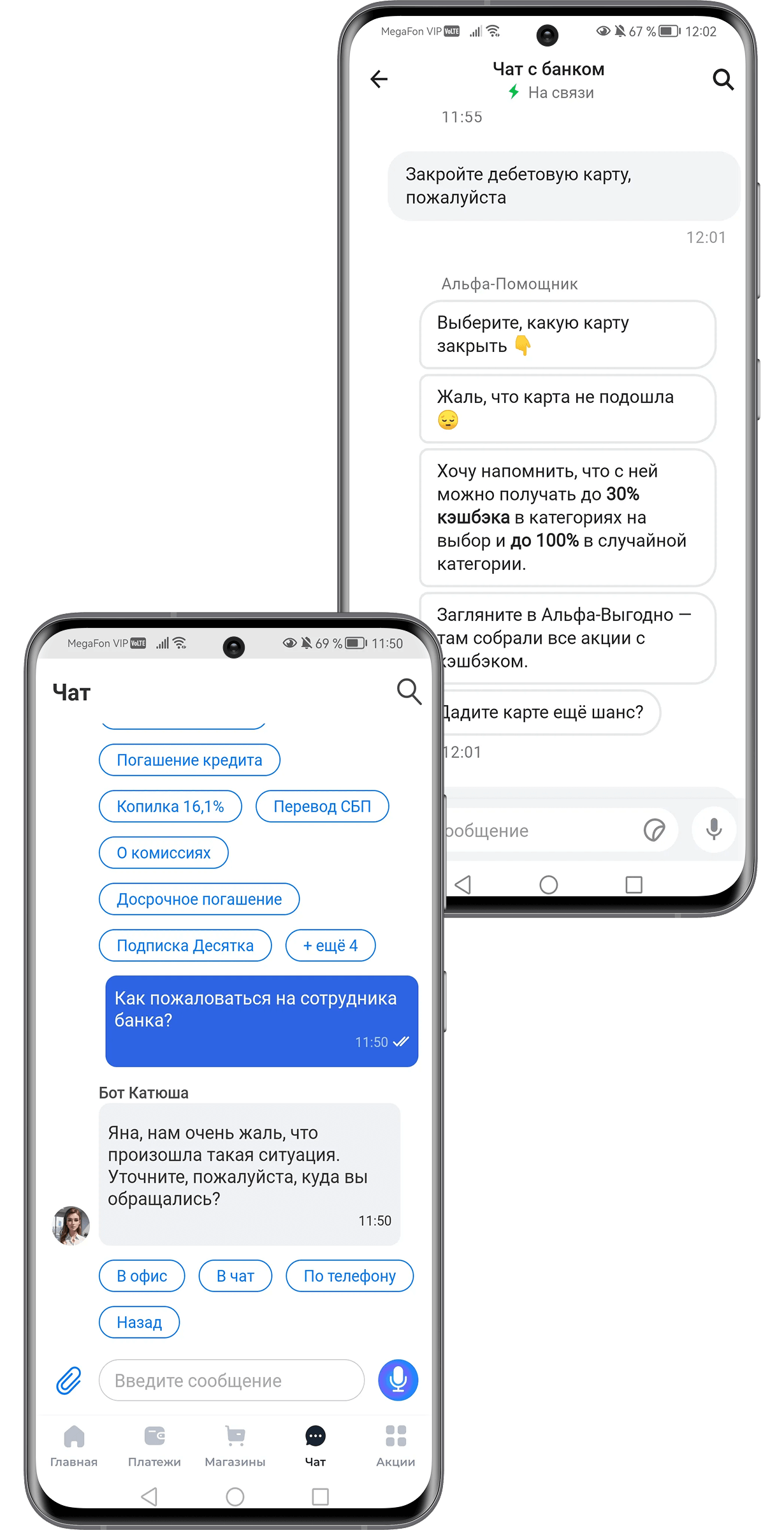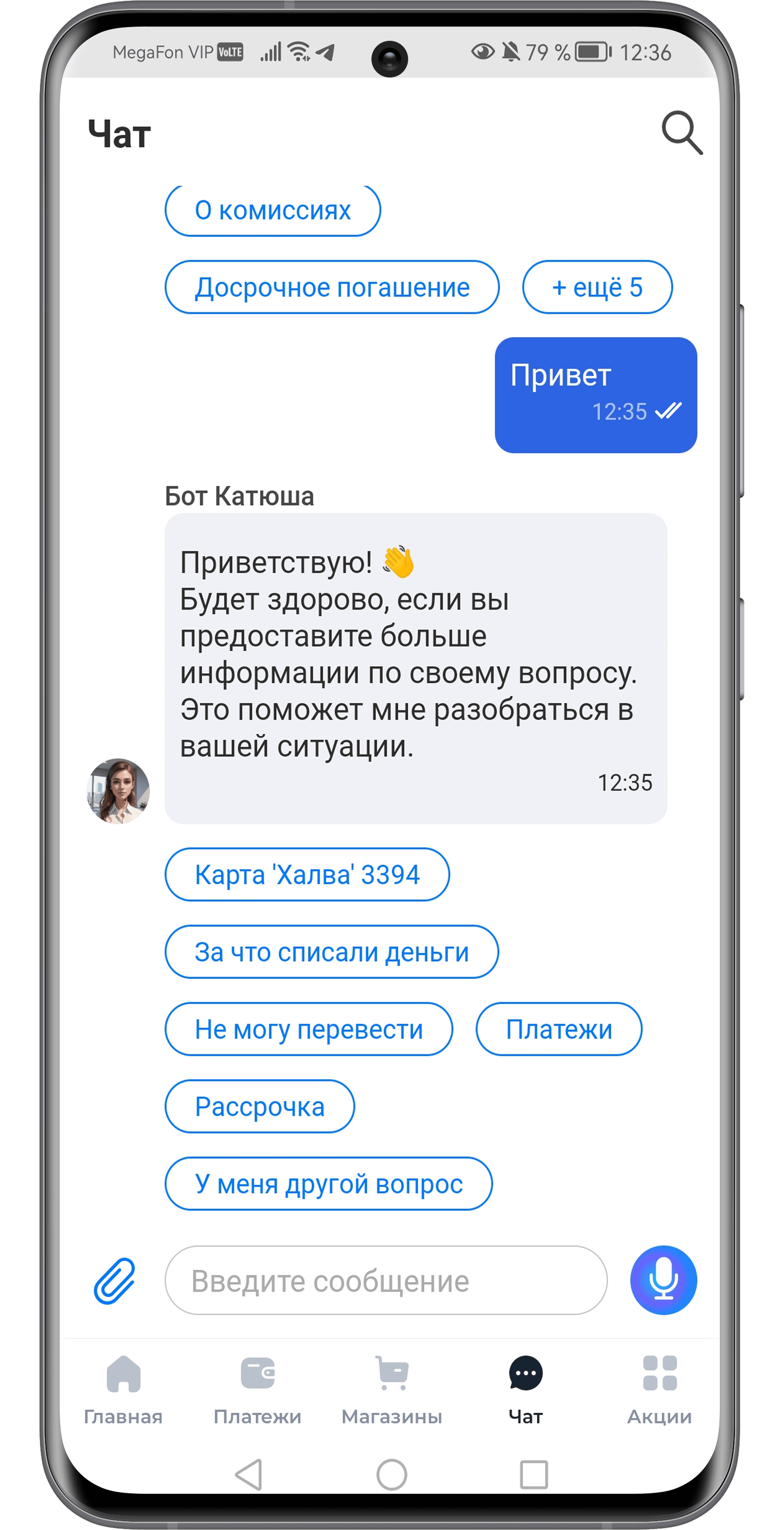 Лучше всего это заметно в ситуации использования кредитной карты. Если есть задолженность, боты в переписке советуют ее погасить до окончания льготного периода, чтобы не переплачивать. Причем советы интегрированы в диалог, даже если запрос пользователя не касался именно этой темы.