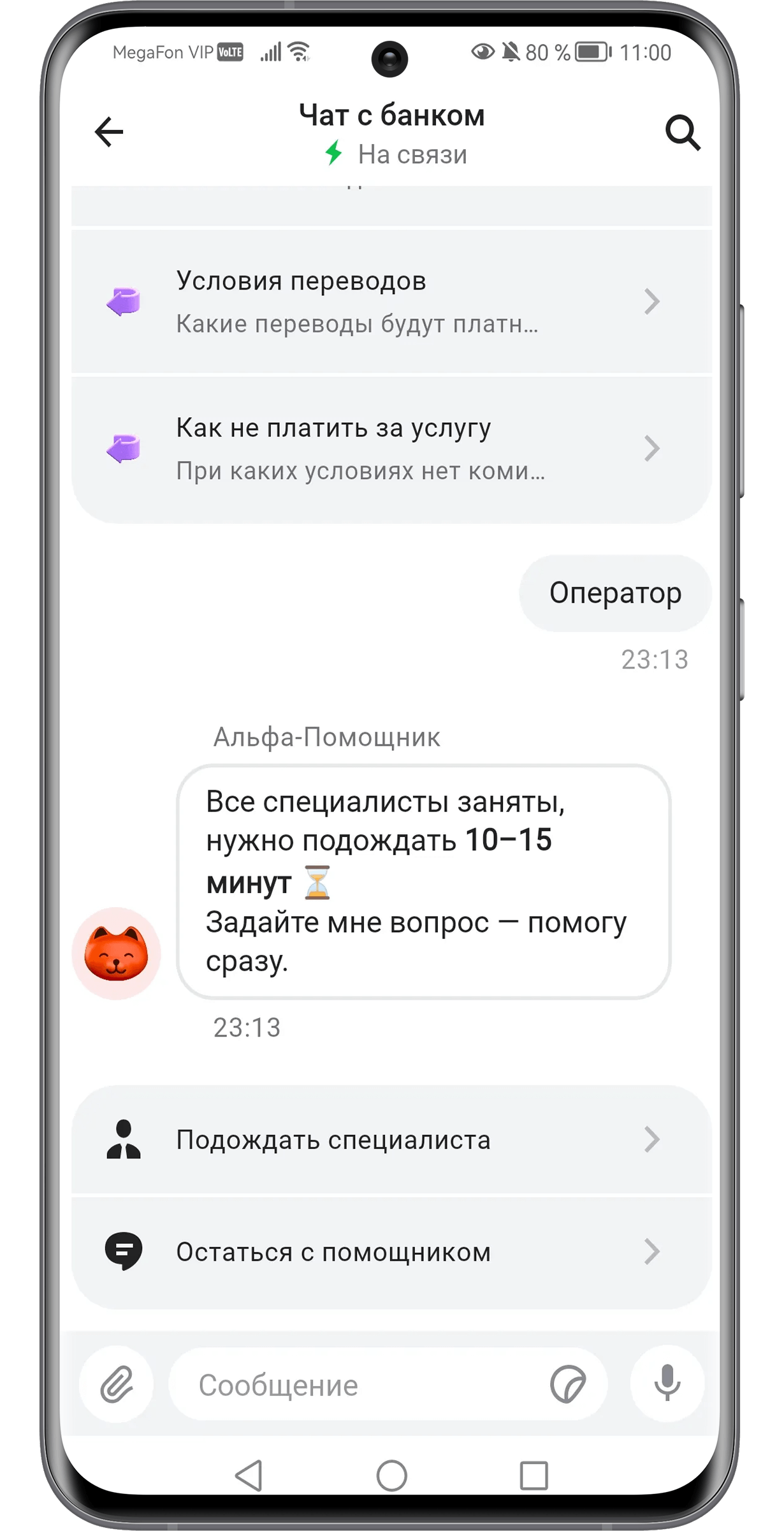 2 бота из 10 пишут конкретное время ожидания, если бот не подключается мгновенно. Например, такое решение есть у Альфа-Банка, и оно полностью или частично снижает неопределенность относительно скорости ответа.
