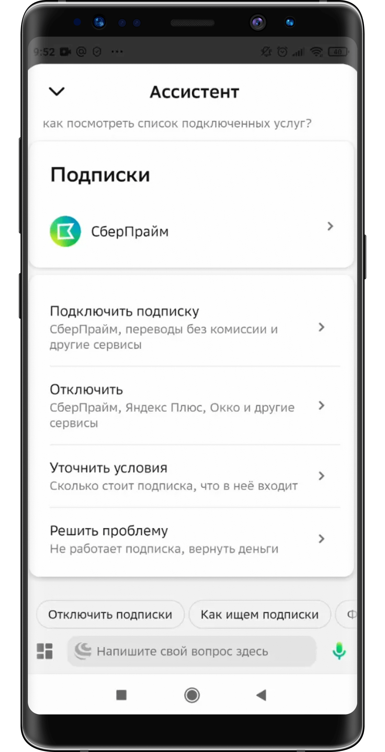 Пользователи чувствительны к навязыванию, поэтому прозрачная подача и быстрый переход к действиям улучшают опыт. У СберБанка при запросе списка подключенных услуг чат-бот сразу показывает все активные подписки в одном виджете — без дополнительных шагов — и тут же предлагает связанный виджет с темами: подключение/отключение, проверка условий, решение проблем. Такая реализация предвосхищает потребности, усиливает ощущение контроля над услугами и финансами и повышает лояльность к боту, поскольку не создаёт барьеров для отключения.