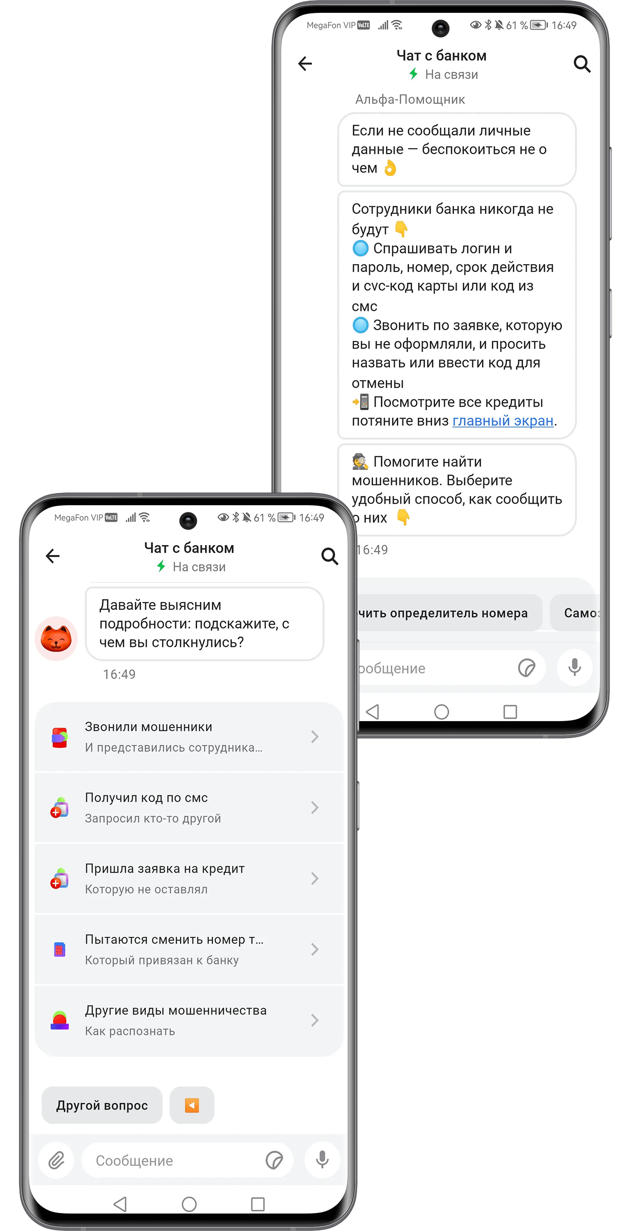 Банки распознают такие обращения, но чаще всего сразу переводят на оператора. У Альфа-Банка реализован более гибкий сценарий: бот просит выбрать тип инцидента (звонок «мошенников», SMS-код, заявка на кредит, смена номера) и уточняет, какие действия совершал пользователь (передача данных, установка приложения, действия в приложении, ничего не передавал). В критических случаях — моментальная эскалация оператору; в некритических — бот сам собирает сведения, объясняет признаки мошенников и дает инструкции (например, не сообщать коды из SMS). Такой подход ускоряет реакцию и снижает ненужные переключения к операторам.