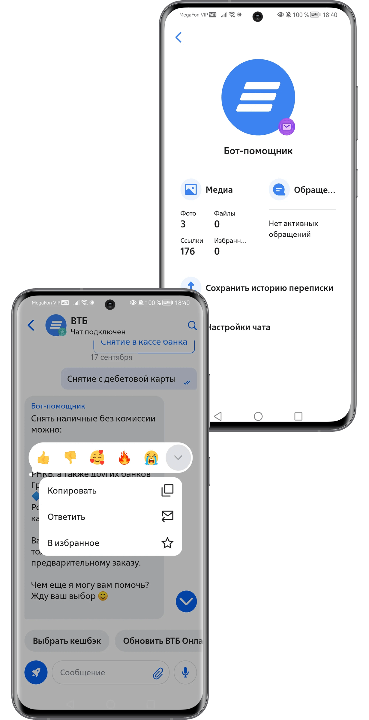 Банки стремятся сделать диалог с ботом похожим на привычные мессенджеры; наиболее продвинут сейчас ВТБ. В чатах доступны действия с сообщениями: ответ, копирование, поделиться в стороннее приложение, отметка о получении. Можно найти нужную информацию через поиск, записать голосовое сообщение и прикрепить файл (например, скриншот). Более редкие функции — просмотр всех присланных файлов отдельно, реакции на сообщения и добавление в избранное. В результате пользователь получает широкий набор возможностей для ввода, просмотра и экспорта информации и может свободнее ей управлять.